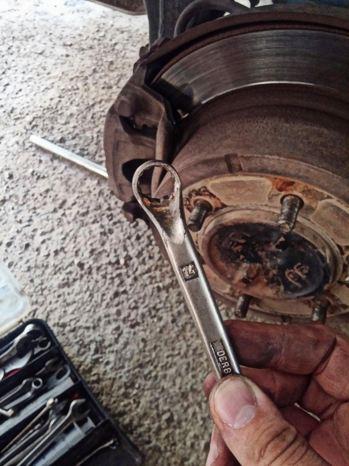 8.בעזרת בוקסה או מפתח רינג במידה 14MM נפתח את הבורג התחתון של הקליפר. שים לב – הבורג נמצא בצד ההופכי לנו – פתח בהתאם!. אם הבורג מסרב להיפתח אפשר לשכנע אותו עזרת מכת פטיש עדינה, זהו אזור שאסור/מאוד לא מומלץ לרסס בחומר שחרור ברגים.