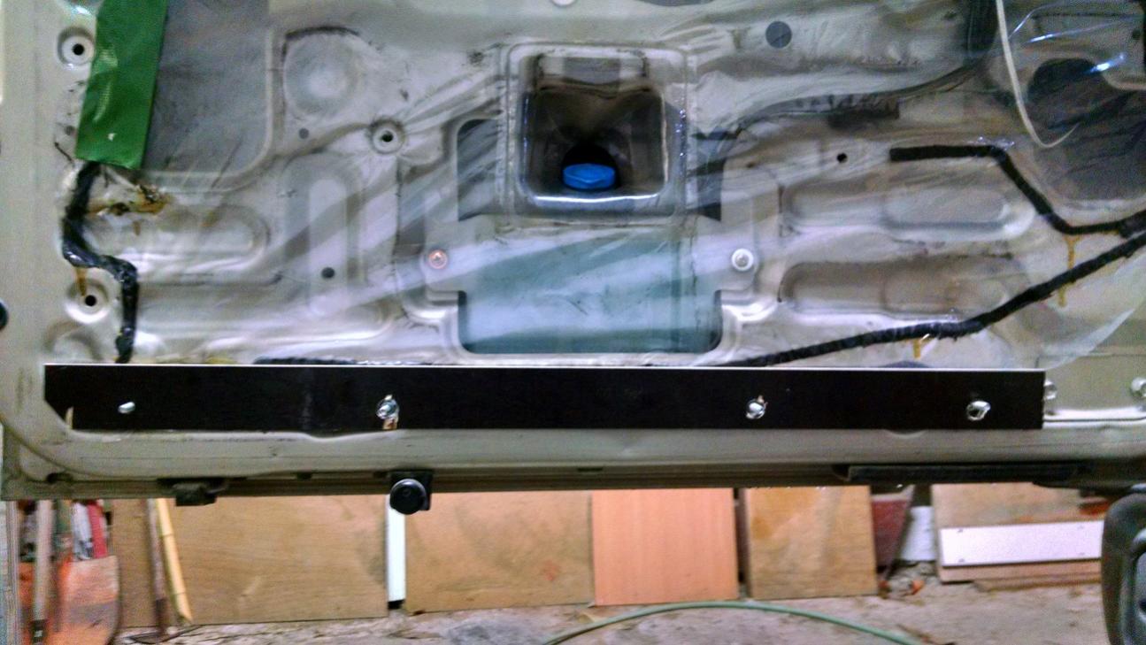 בחלק התחתון של הפנל, מבפנים, יש שלוש תושבות של פינים שמשמשים לחיבור הפנל. התושבות של הפינים נחתכו (עם משחזת) ובמרכז של כל אחד מהם, קדחתי חור 7 מ"מ, חור רביעי נקדח לפי המרחק של הבורג הרביעי שחיברתי על הדלת.