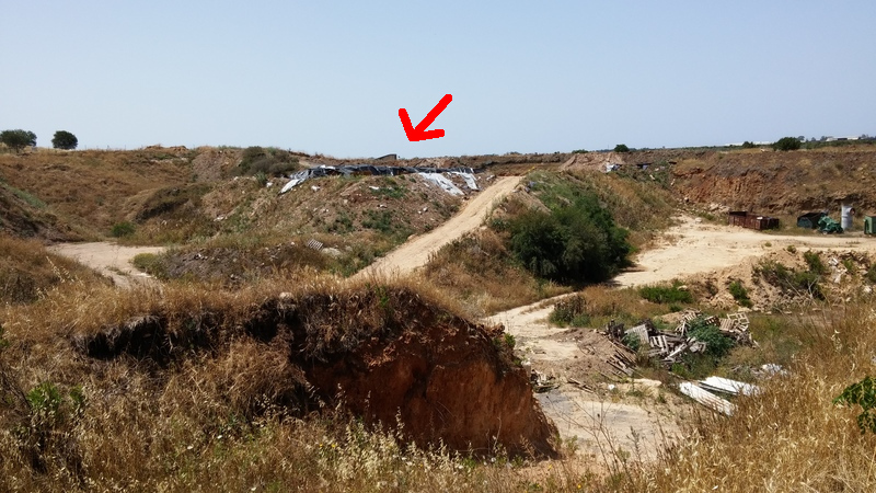 בהמשך המחצבה התקדמה מסביב למנהרה והושארה סוללה מתחת למסלול המנהרה כדי לשמור עליה. מאוחר יותר שימש הבור להטמנת פסולת והיום מכוסה כמעט לגמרי בהררי אשפה. בתמונה אפשר לראות את חלק הבור שנשאר פתוח ואת החלק שנשאר גבוה בגלל המנהרה.