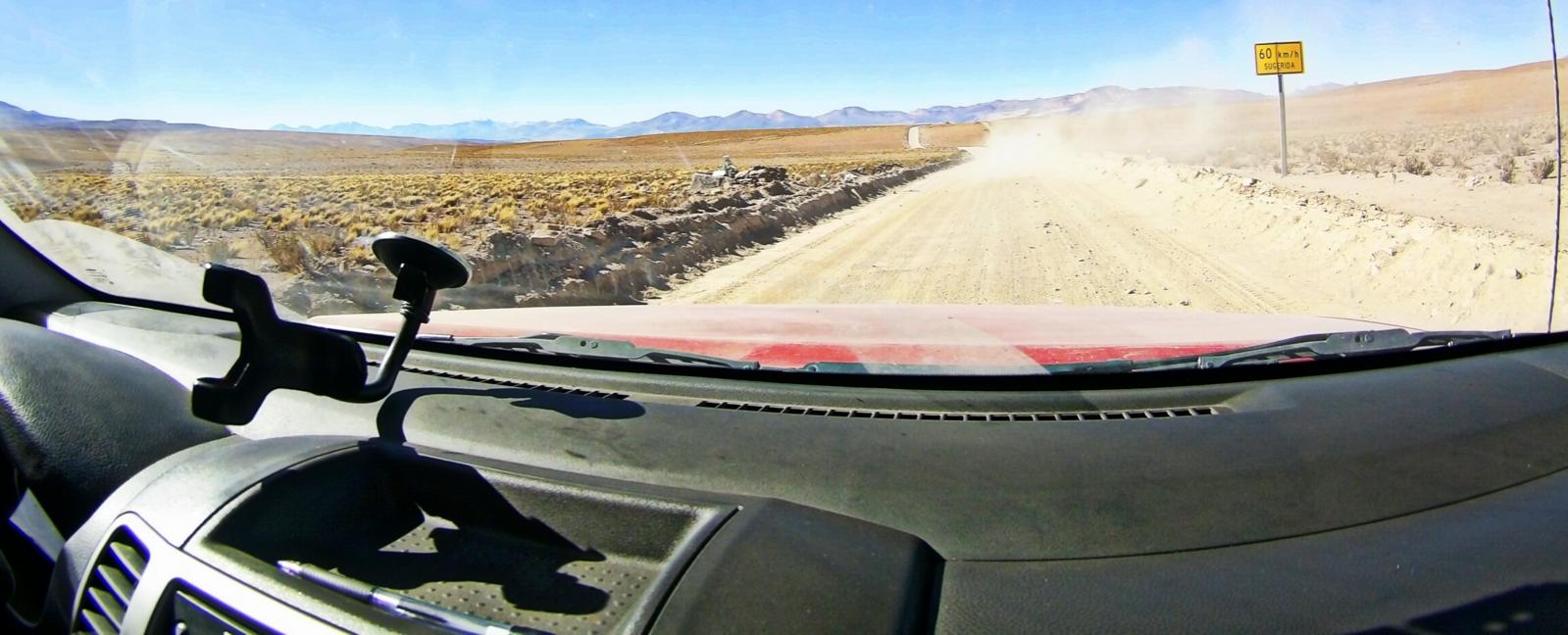 איפשהו בשליש הדרך הכביש נגמר והשביל מתחיל השלט שאומר 60 קמ"ש הוא יותר כאתגר מאשר הגבלה, כל הטנדרים מההשכרה מצויידים לכל הפחות בצימגי A/T ולרוב עם זוג ספייר.