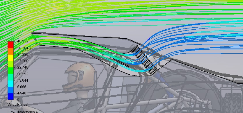 בתצורה הנוכחית אתה עלול לקבל "מסה" של אוויר שיושבת בתוך התעלה ולא נותנת לשכבה שאתה חושב שאתה מושך פנימה, להיכנס. ההתנגדות מהרדיאטור מאוד גדולה בגלל הזווית שלו, ובסופו של דבר כל האוויר עלול לזרום מעל הרכב כי בכניסה לכונס תהיה "חזית" עומדת.