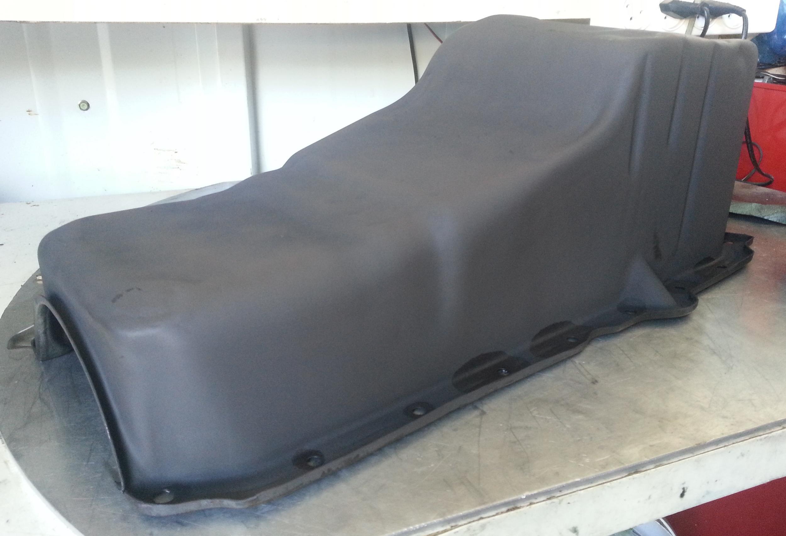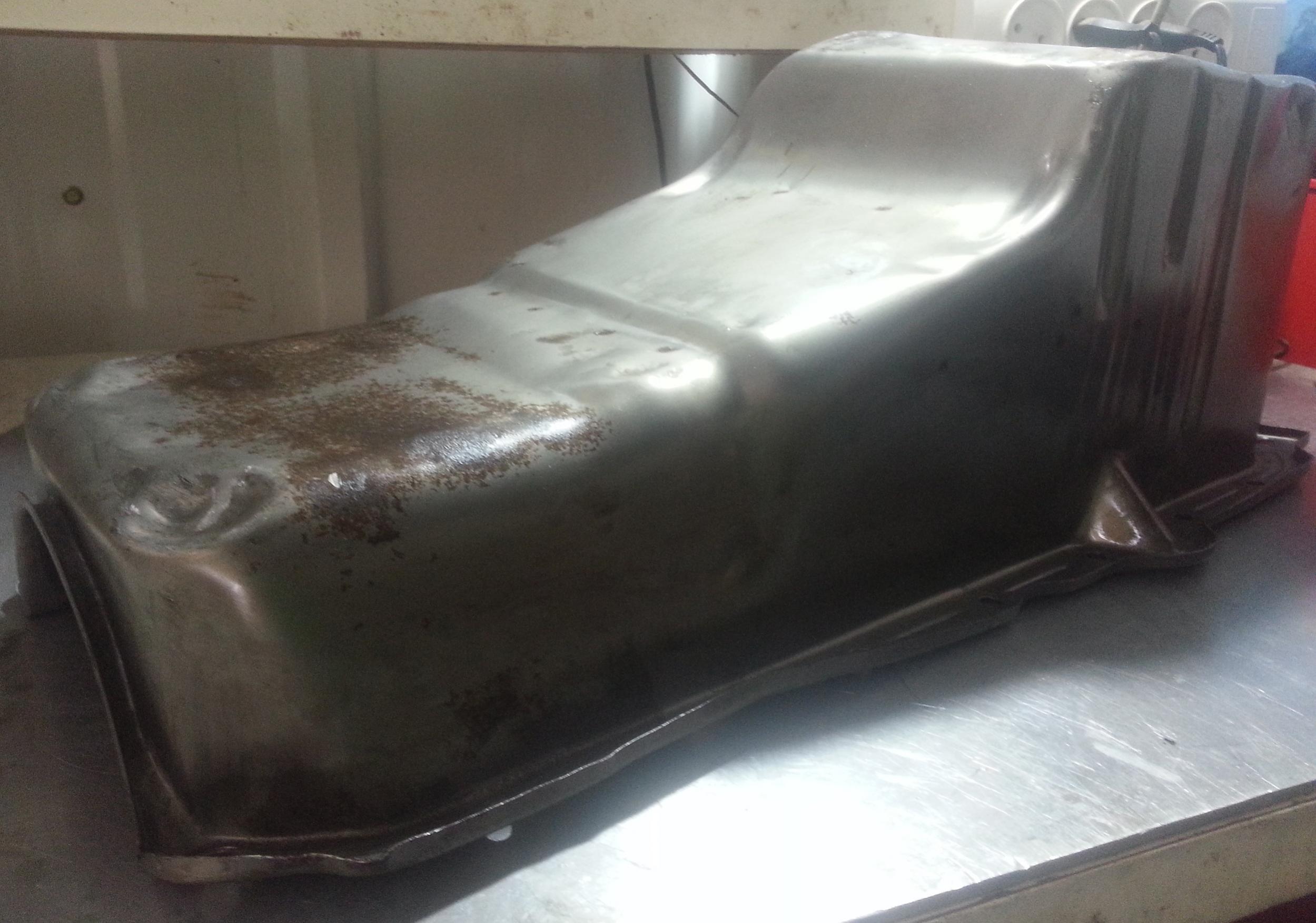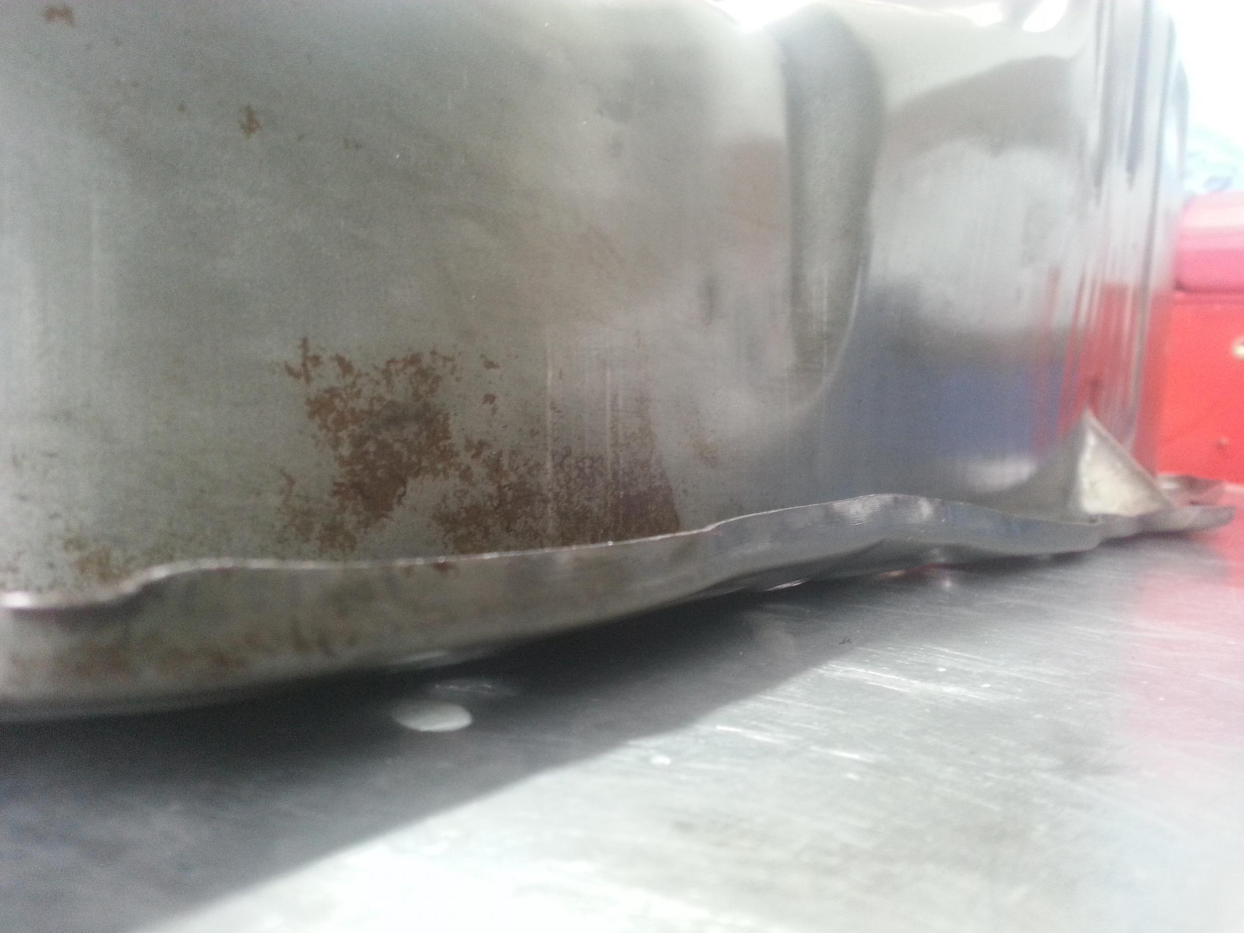 החיסרון בכל הסיליקון הזה הוא שהמכסים נדבקים לבלוק ובזמן הפירוק אין ברירה אלא לעקם אותם בשביל לשחרר את ההדבקה. אגן השמן שלי לא היה יוצא דופן ובתמונה אפשר לראות כמה התעקם המשטח שאמור לבוא במגע עם הבלוק. האמת היא שאחרי כמה עשרות שנים המצב הכללי של האגן לא היה מזהיר וניתן לראות כמה וכמה מכות בדופן התחתונה של האגן וחלודה.