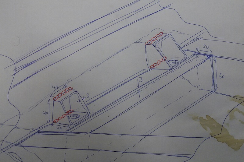 אני חושב שזה פחות או יותר מה שאני הולך לבצע - מקווה שהשרטוט ברור. גשר הגיר שבניתי שטוח לגמרי, ויושב מתחת לקורות השלדה כמו במקור. הכוחות עוברים בצורה ישירה בין הגשר לקורות השלדה. צריך ארבע ברגים בריאים במתיחה שיהדקו את הגשר לשלדה. השיטה המקורית מצויינת, הבעייה שלה שהיא קשה לתחזוקה. כל מה שצריך לעשות זה להעביר את החור של הבורג החוצה. נראה לי שהדרך היעילה ביותר היא על ידי תושבות קטנות נפרדות. הריתוך המבני היחיד הוא העליון, שנמתח. הוא לאורך הקורה, וכמעט באמצע שלה - המקום הכי בטוח לרתך אליו. החלק התחתון של התושבת עובד בלחיצה, הריתוך שם הוא סמלי ובעצם זה רק פיק כדי להחזיק את התושבת במקום. הלחיצה עוברת ישירות לחלק התחתון של הקורה. התושבת לא תשב במישור אחד עם תחתית הקורה אלא מרחק של מ"מ או שניים מעל כדי ששטח המגע בוודאות יהיה עם הקורה ולא עם התושבת הקטנה גם עם המעט שהיא תתכופף. ברגים ואומים פשוטים - אני מניח שאלך על קוטר 1/2 או 9/16- עם גישה חופשית להידוק והחלפה.
