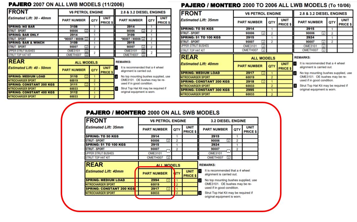 לגבי הקפיץ הקדמי - אפשר לראות כי הקפיץ לדגם הקצר, ללא כננת או פגוש מתכת, לפי היצרן הוא 2915. ניתן גם לראות בטבלה מעל כי קפיץ 2915 מומלץ על ידי היצרן כקפיץ לפג'רו ארוך עם כננת ופגוש מתכת (עומס כבד). לדברי היבואן והמתקין, התקנת קפיץ 2915 על פג'רו קצר בעומס נמוך תביא את הרכב לקשיחות גבוהה מאוד ולא נעימה (על אף שהיצרן ממליץ על כך) ואינם מצליחים להבין כיצד יתכן שהוא מומלץ לקצר ללא עומס ולארוך כולל עומס. הם הציעו להתקין מקדימה אצלי בפג'רו הקצר את קפיץ 3109 המיועד לגרסה הארוכה בעומס משקל בינוני. לדבריהם, מנסיונם, זה נותן את השילוב הטוב ביותר של גובה ונוחות נסיעה.