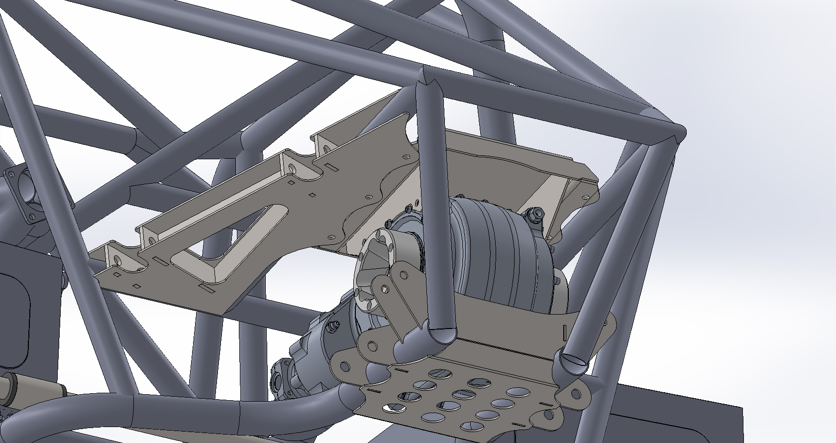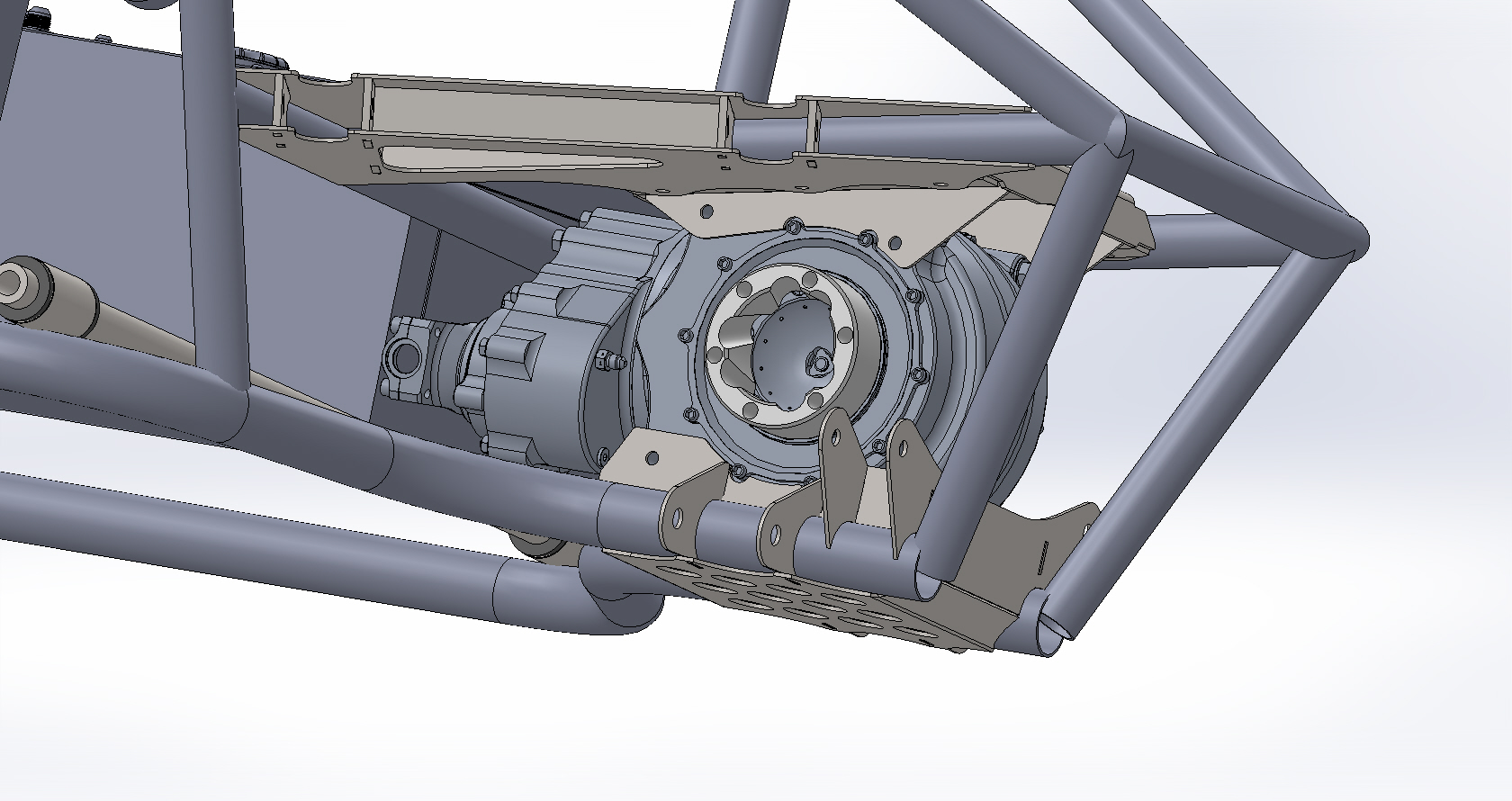בתמונה רואים את ההאוזינג של הדיפרנציאל הקדמי,אותו מידלנו. ממנו וסביבו נלקחו לכל כיוון התושבות של הזרועות התחתונות ,העליונות ומסרק ההיגוי, דרך אותן תושבות גם עוברת ,בחורים יעודיים כל צנרת השלדה- השלוחה הקדמית והן האחורית, מה שמוסיף דיוק למבנה השלדה עצמה.