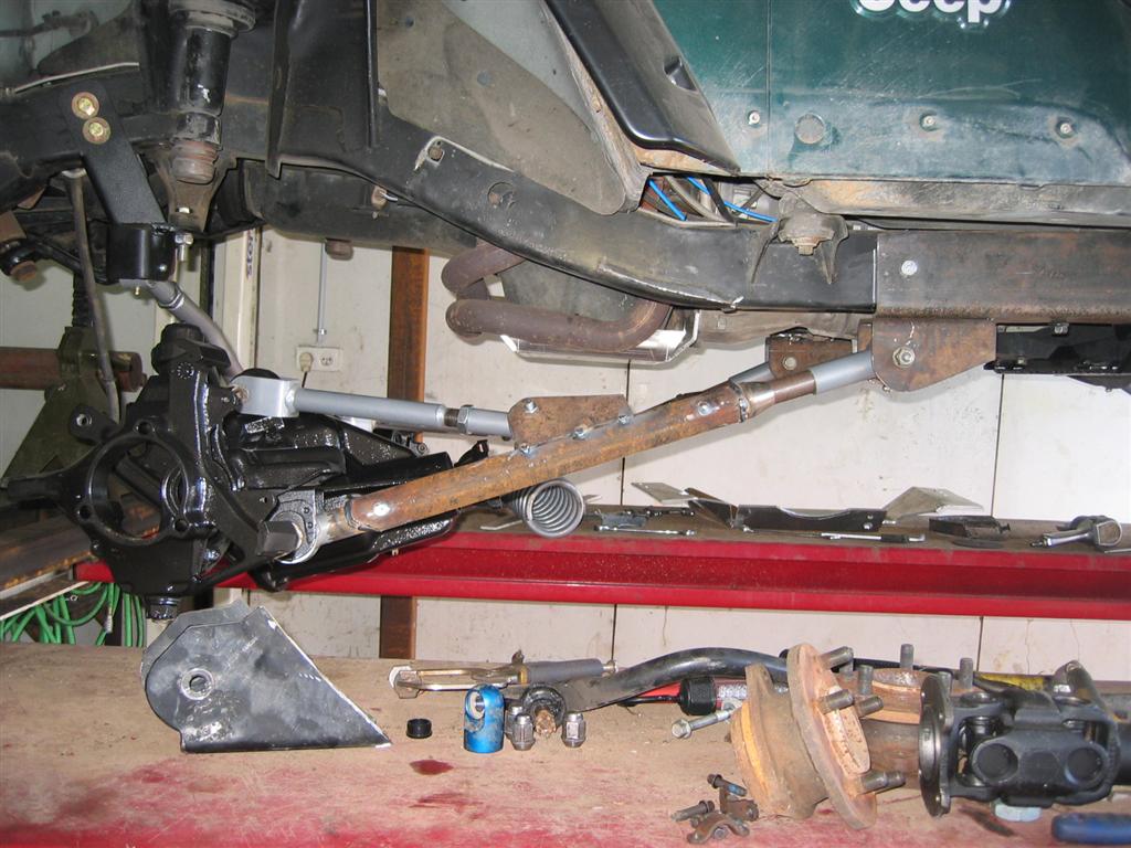 אתה יכול להשוות לתמונה הזאת של מתלה דומה, הג'יפ שלי, בתצורה מקורית משופרת - short arms. כל החיבורים בצד הסרן זהים, מה שעושים זה בעצם לחבר את הזרוע העליונה למרכז הזרוע התחתונה, לתושבת אחת על השלדה שנמצאת הרבה יותר מאחור. מקבלים זרועות ארוכות מאד שעובדות בזוית סבירה, מה שלא אפשרי עם זרועות קצרות בהגבהה מעבר ל4.5-5 אינץ'.