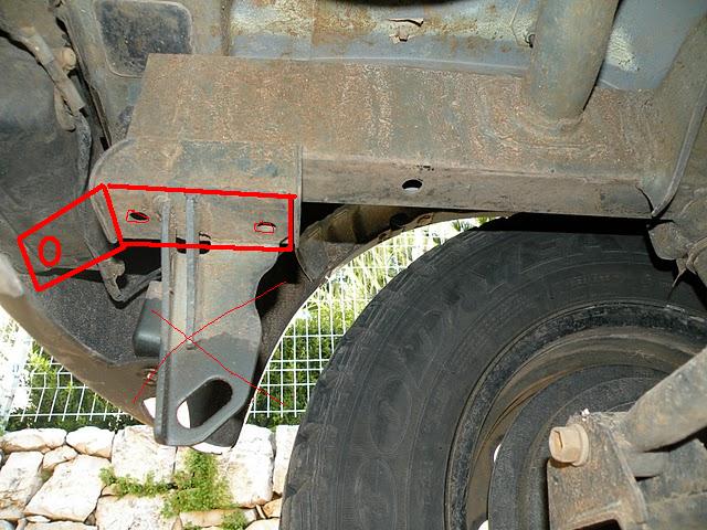 קח דיסק ותחתוך את הנקודה המקורית. נשארת עם פרופיל U שמרותך לשלדה. קח סרגל בעובי 4 מ"מ שיחזק את הצד התחתון של ה U. עם תבריגים M10 הברגה עדינה מתאימים במיקום לזוג הקדחים המקוריים. הוא צריך להיכנס מבחינת רוחב בתוך ה U. קח עוד סרגל, בדיוק ברוחב של ה U, ארוך ב 50 מ"מ מהU. כופף אותו ב30 מעלות, בצורה כזו שיהיה לו חלק ארוך טיפה פחות מהאורך של ה U, וחלק של 50 מ"מ מכופף כלפי מטה. קדח בו שלושה קדחים - בחלק הארוך שני קדחים של 11 מ"מ בדיוק במיקום של הקדחים המקוריים, ובחלק של ה 50 מ"מ, קדח של 13 מ"מ. עם אותו מקדח 11 מ"מ, תנקה את שני הקדחים המקוריים ב U.