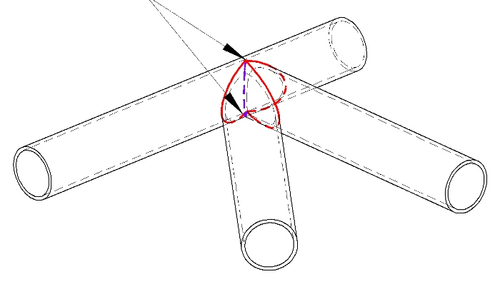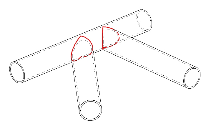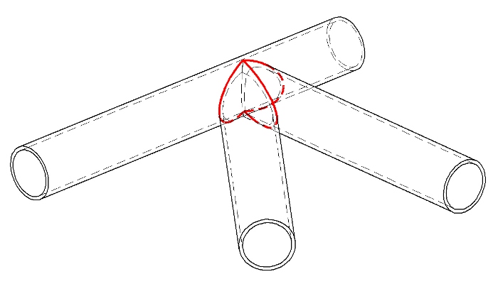 צומת קיים של שני צינורות, נניח קשת ראשית ומוט אורך של הגג. צריך להוסיף אלמנט נוסף לצומת, אלכסון גג. הקווים האדומים מציינים את הריתוך הקיים.