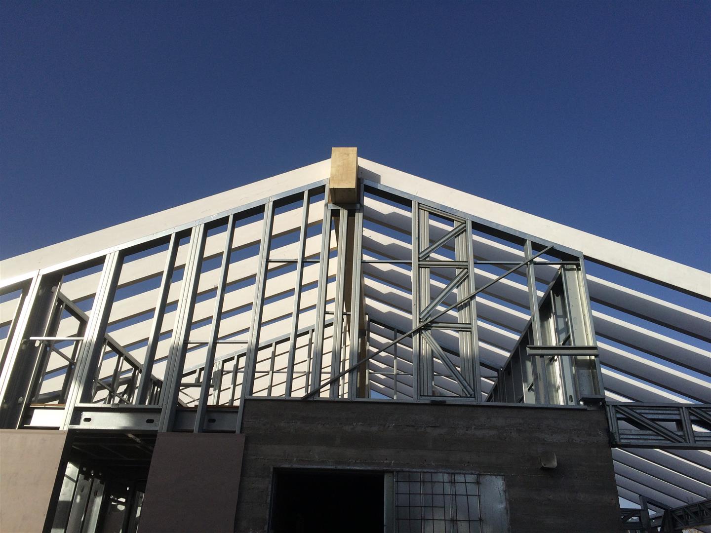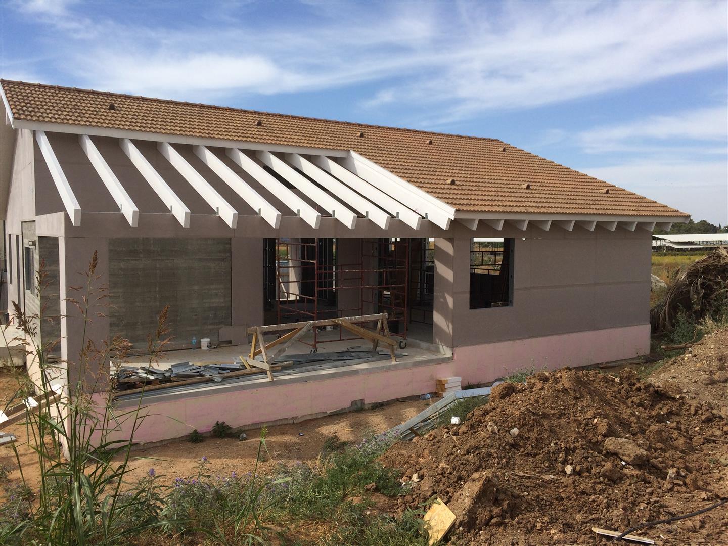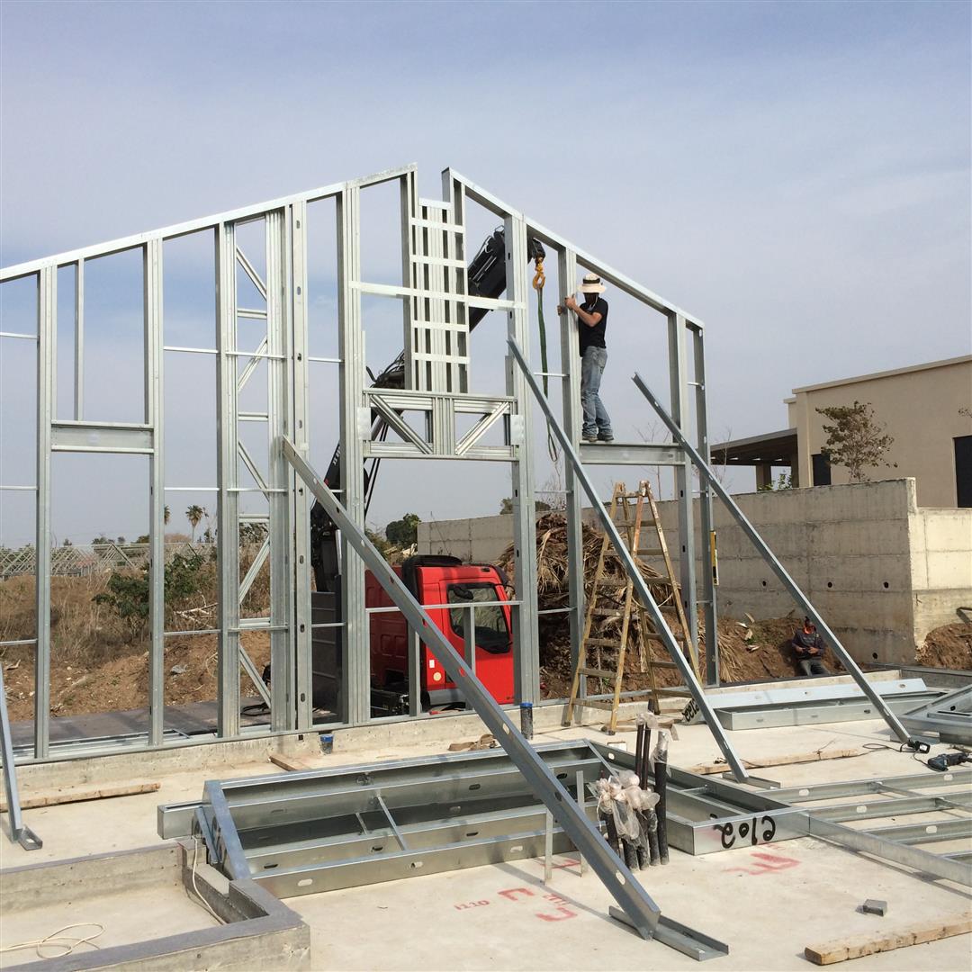 לאחר שכל השלד עומד ומפולס וקורות יסוד מבודדות, מתחילים עם הרכבת הגג והשכבה הראשונה של החיפוי החיצוני (חתך קיר (מבפנים החוצה) של 2 פלטות גבס 12.5 מ"מ - ניצבי פלדה וביניהם 150 מ"מ צמר אדמה מירלי - פלטה צמנטית (וילהבורד) בעובי 6.5 מ"מ - יריעת חסם אדים - לטות עץ 50X40 - פלאנקים צמנטיים בעובי 14מ"מ)