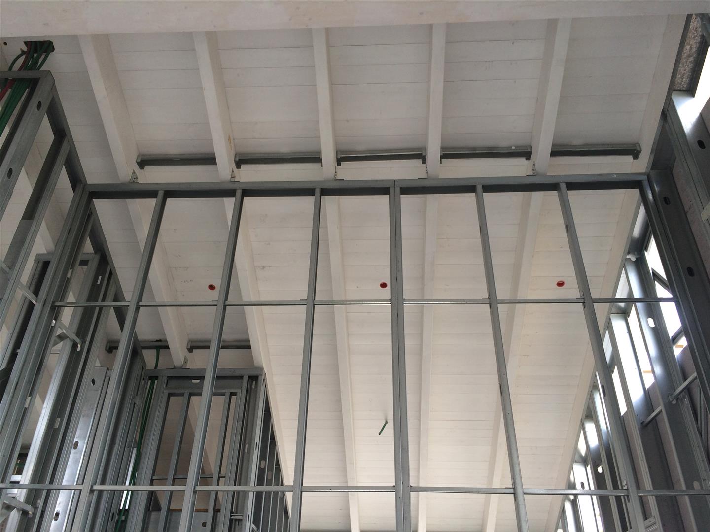 קודם צריך להוסיף פרופיל פלדה בין הקורות עץ כדי שיהיה אפשר להתחבר עם הפלטה הצמנטית. (התמונה הבאה היא של קיר פנימי אומנם, אבל העיקרון בקירות חוץ זהה)