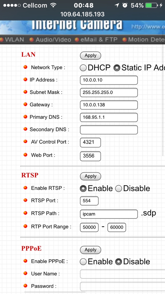 3- תפתח את ה CLIENT על הטלפון, תכניס את הכתובת של המצלמה (10.0.0.10) ואת הפורט של המצלמה. תוודא שבכל עובד בסדר.