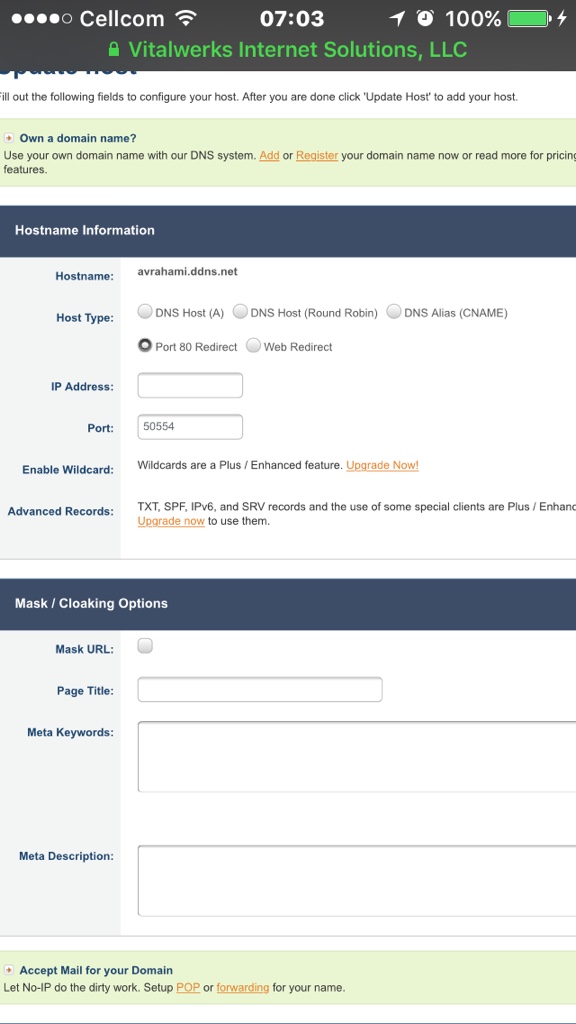 לכן, מה שאתה צריך לעשות זה להגדיר HOST מסוג A לכתובת IP שלך. השירות של NOIP בכלל לא אמור לגשת לפורטים. זה לא מעניין אותו.