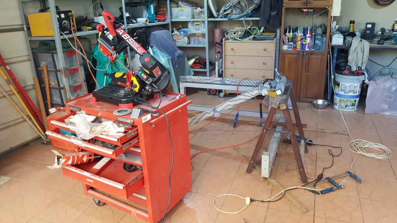 בפינה הימנית - פינת הברזל. שולחן מעשה ידיי, רתכת חד פאזית JASIC. מאחוריה יש קופסת חשמל חיצונית עם חד פאזי ותלת פאזי (כששיפצתי לא ידעתי שיש חד פאזי כל כך מוצלחות, השקע שם בשביל רתכת).