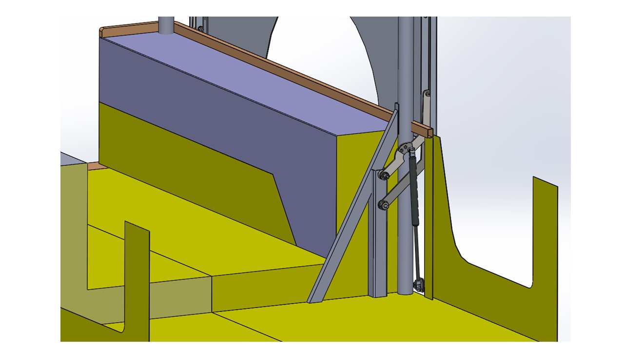 רוב עבודת התכן התמקדה כרגע במנגנון ההרמה והצורה שהוא מתחבר לבודי וכל מרכיביו. בסופו של דבר המנגנון (יחד עם בוכנות הגז) הוא זה שמכניס לי את מירב האילוצים המכאניים ומכתיב מיקומים ועיגונים של רכיבים ופחים.