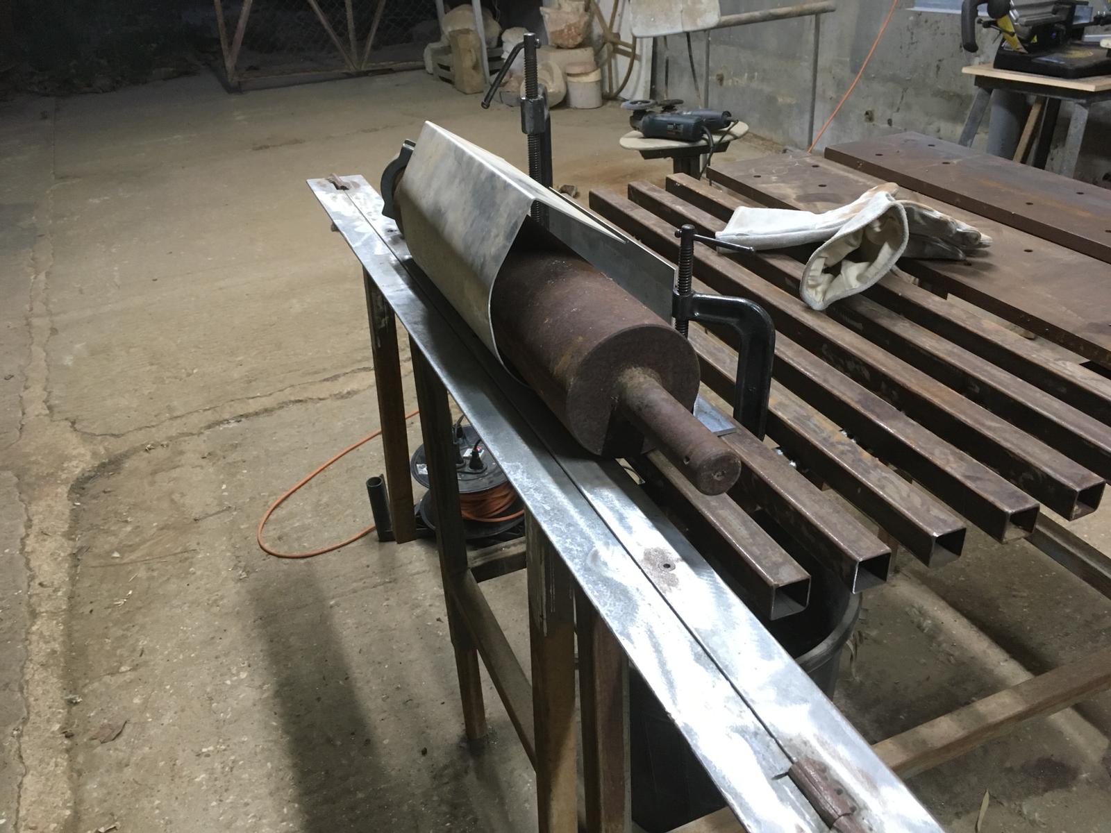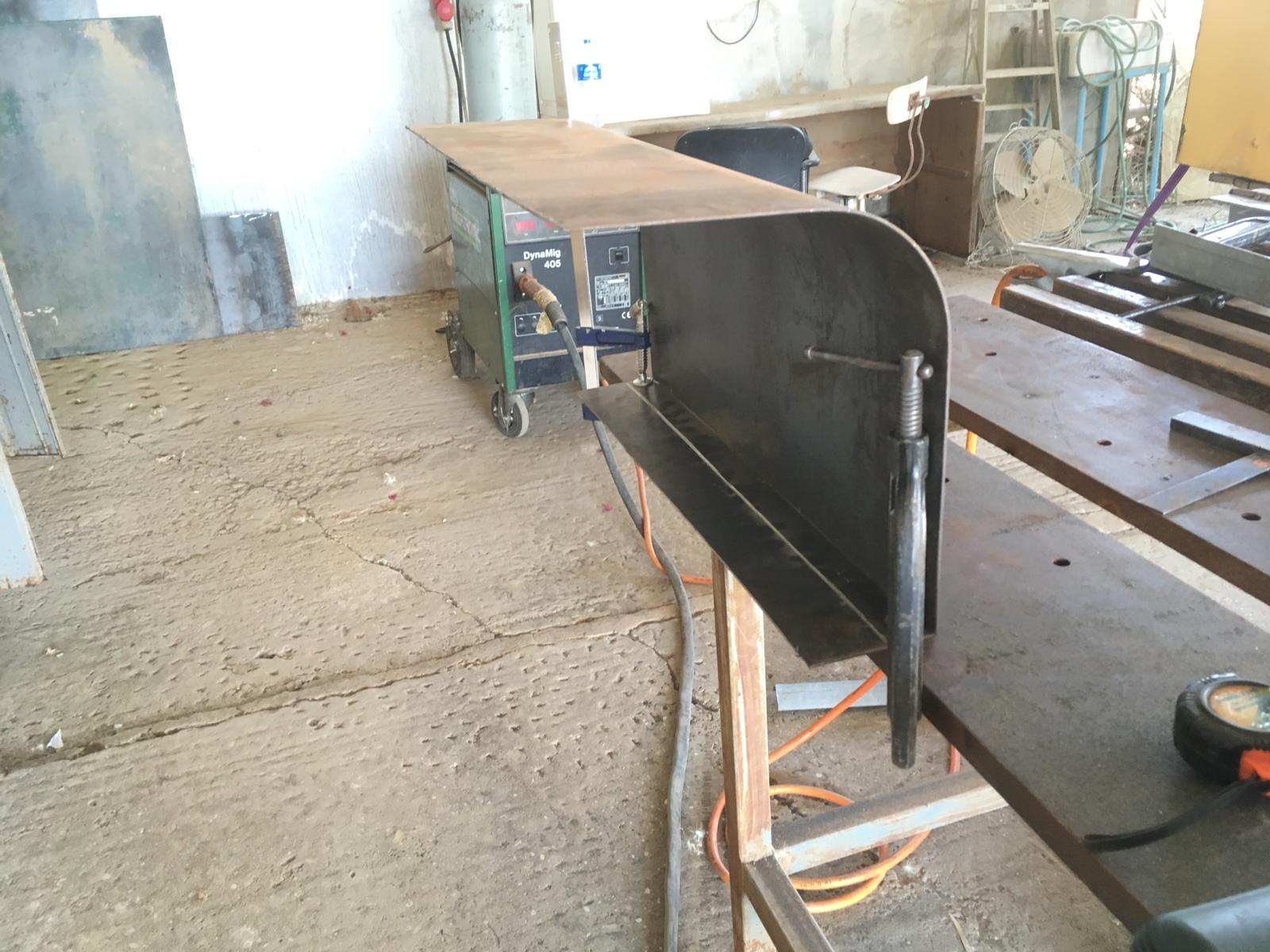 כיפוף רדיוס הפינה עבר בסדר. השתמשתי בפח 2 מ"מ שלא קל לכופף אבל מה שלא הולך בכוח הולך ביותר כוח. הקיר קיבוע שחיברתי לגליל קיבל עוד כמה חיזוקי אלכסון שרותכו באופן זמני לשולחן: