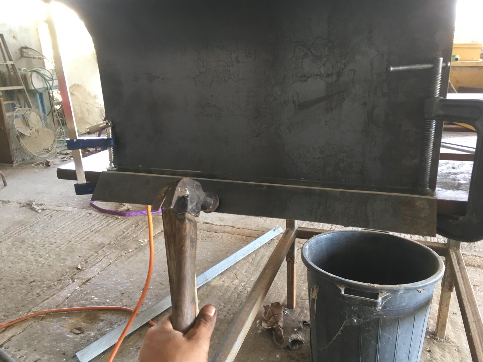 כיפוף שני לצד השני, לא מתאפשר במתקן בגלל הגאומטריה של החלק. במקום, הפנל מקובע לקצה השולחן ומכופף ידנית עם פלייר ומכות פטיש: