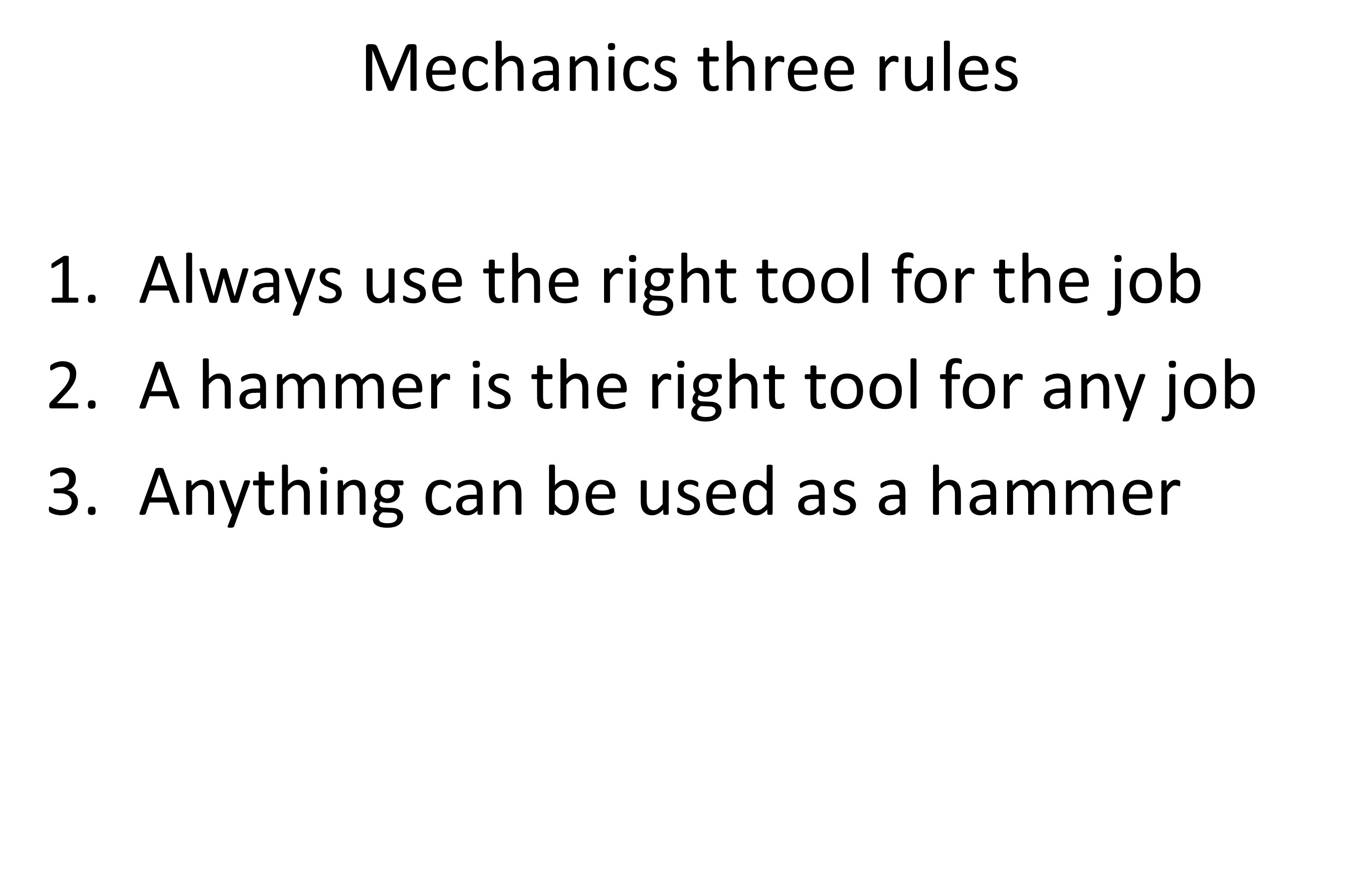 עוד טיפ שקיבלתי ממישהו שעזרתי לו עם רכב מהטיפוס הזה של מגוון ארגזי כלים למגוון עבודות - יש כמה פריטים שאתה צריך בכל ארגז כלים. במקרה שלו היה מדובר על קליבר ועוד איזשהו גאדג'ט ייעודי (לאנשים שמפרקים ומרכיבים רובים ומקלעים אני לא מבין בזה) שהיה ממש בכל אחד מהארגזים כך שלא משנה אם הולכים לתקן ציוד כזה או כזה - במקרה שלך אם אתה יוצא לעבודת חשמל או גז (נגיד) - לא תצטרך לחזור לאוטו בשביל טוש או איזולירבנד.
