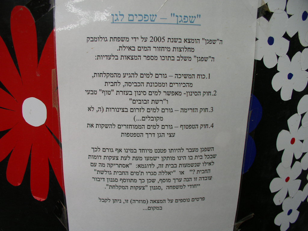 לאחרונה הוספתי גם איסוף למי האמבטיה והמקלחת, שכרגע נשפכים ישירות בצינור לדשא,אותו אני מזיז כל יום, והוא גם נראה שמח וטוב לבב.(אני גר בבית קרקע מוגבה מעט מהאדמה, כך שיש לי מקום לשחק עם הצנרת , ולהוליך מיים בגרביטציה)