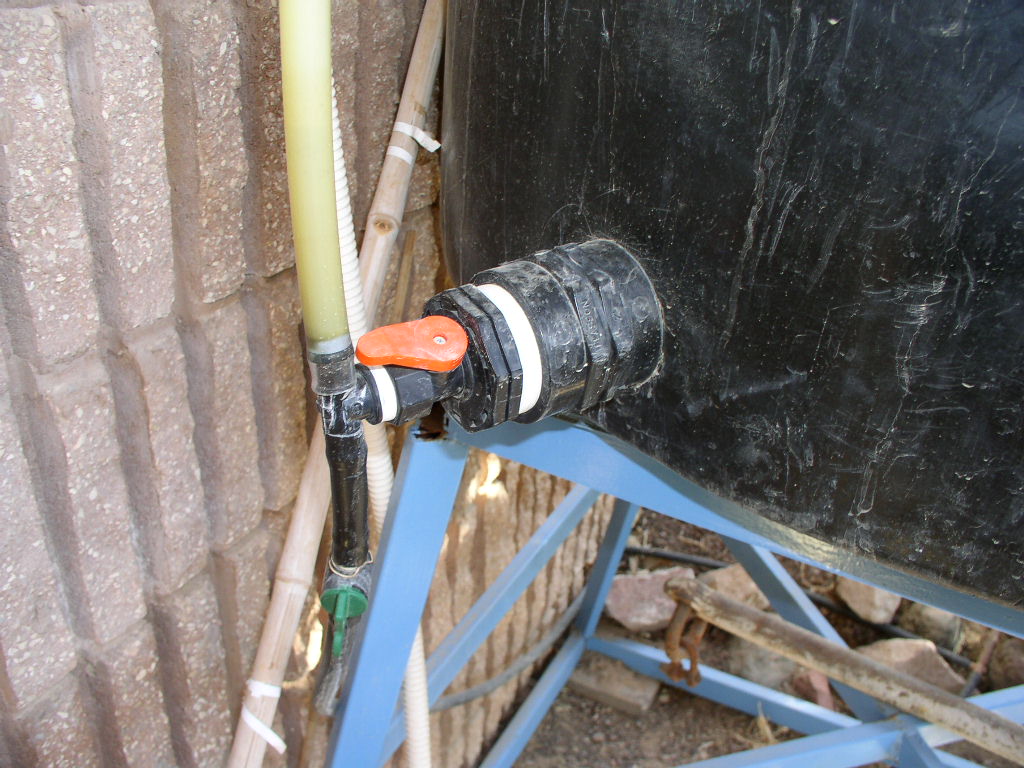 בכניסה למיכל שמתי דלי מחורר ובתוכו רשת זבובים כפולה. ניסיתי בעבר כל מני נסיונות עם טופ וחצץ אבל בסופו של דבר השיטה הקיימת היא הטובה ביותר לסנן מוצקים. מהמיכל דרך ברז גינה פשוט יוצא צינור שמתחבר למערכת הטפטפות של הגינה. הרכבתי על הברז גם צינור שקוף כלפי מעלה כך שאני יודע את גובהה המים במיכל. וזהו.