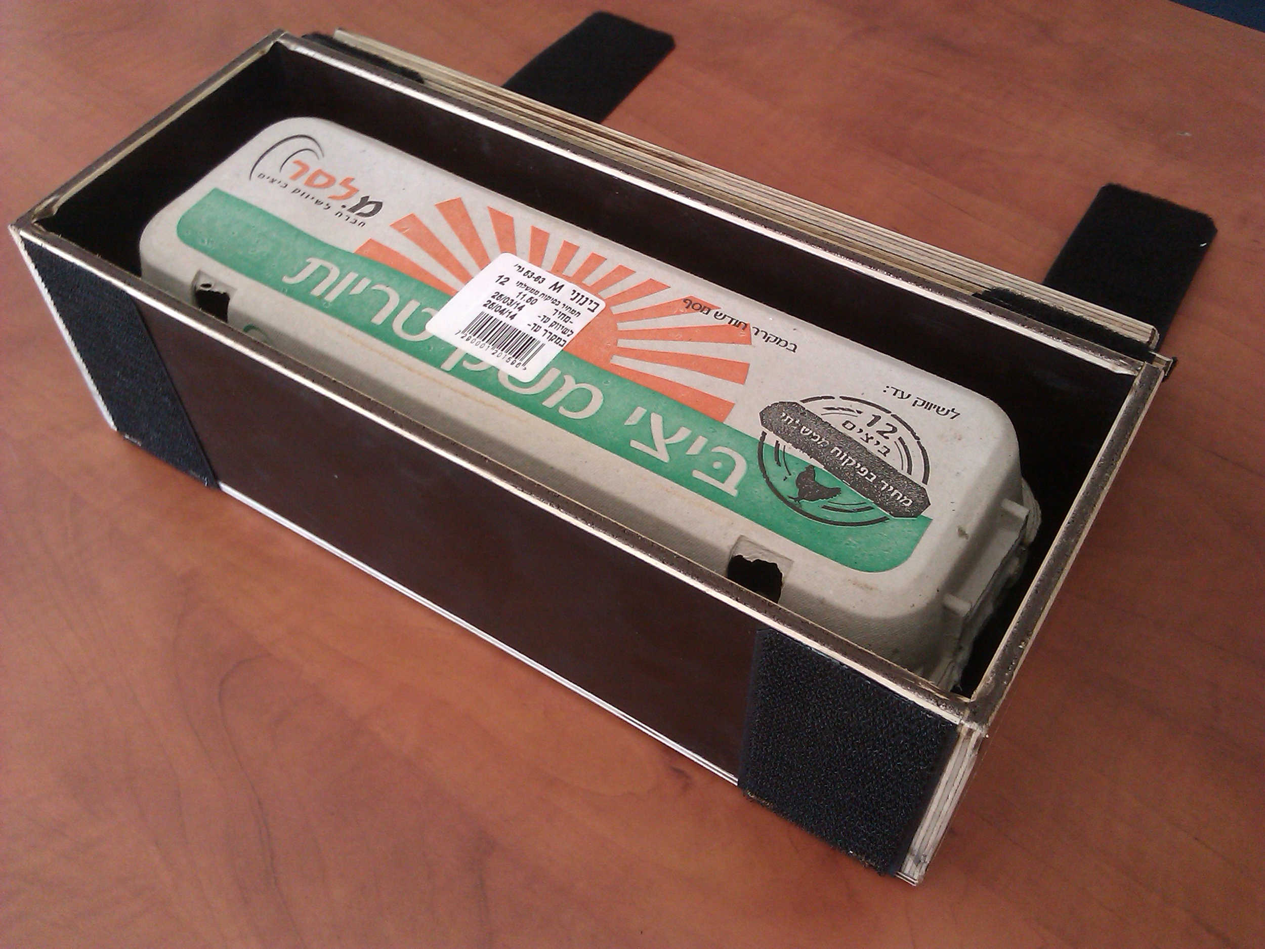 הביצים יושבות בתוך הקרטון המקורי שלהן אך הוא יושב בתוך הקרטון הקודם שנחתך לשניים וכך המצע המשכך מוכפל וגם כושר הספיגה של ביצה שבורה מוכפל. במסעות עבירות של שטח טכני ניתן לעטוף הכל ביריעת פלסטיק נצמד במספר שכבות ואז אין גבול לבטיחות הביצים.