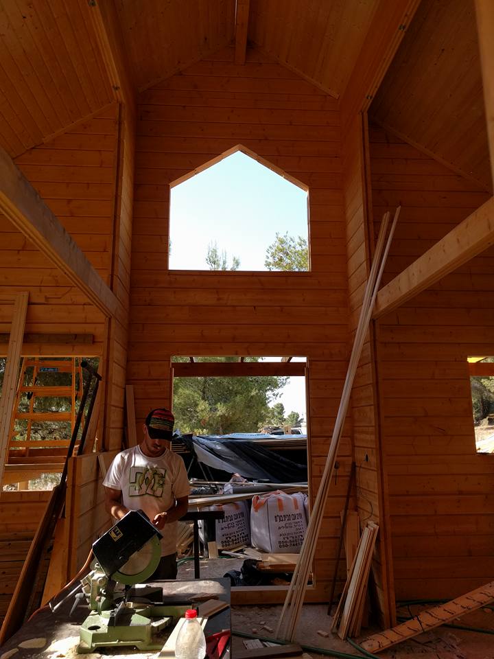 הבחור בונה לאט-לאט, כשחצר עץ הולך ליער מאחורי הבית (יש לו 40 דונם יער ), ומביא לוג חדש.