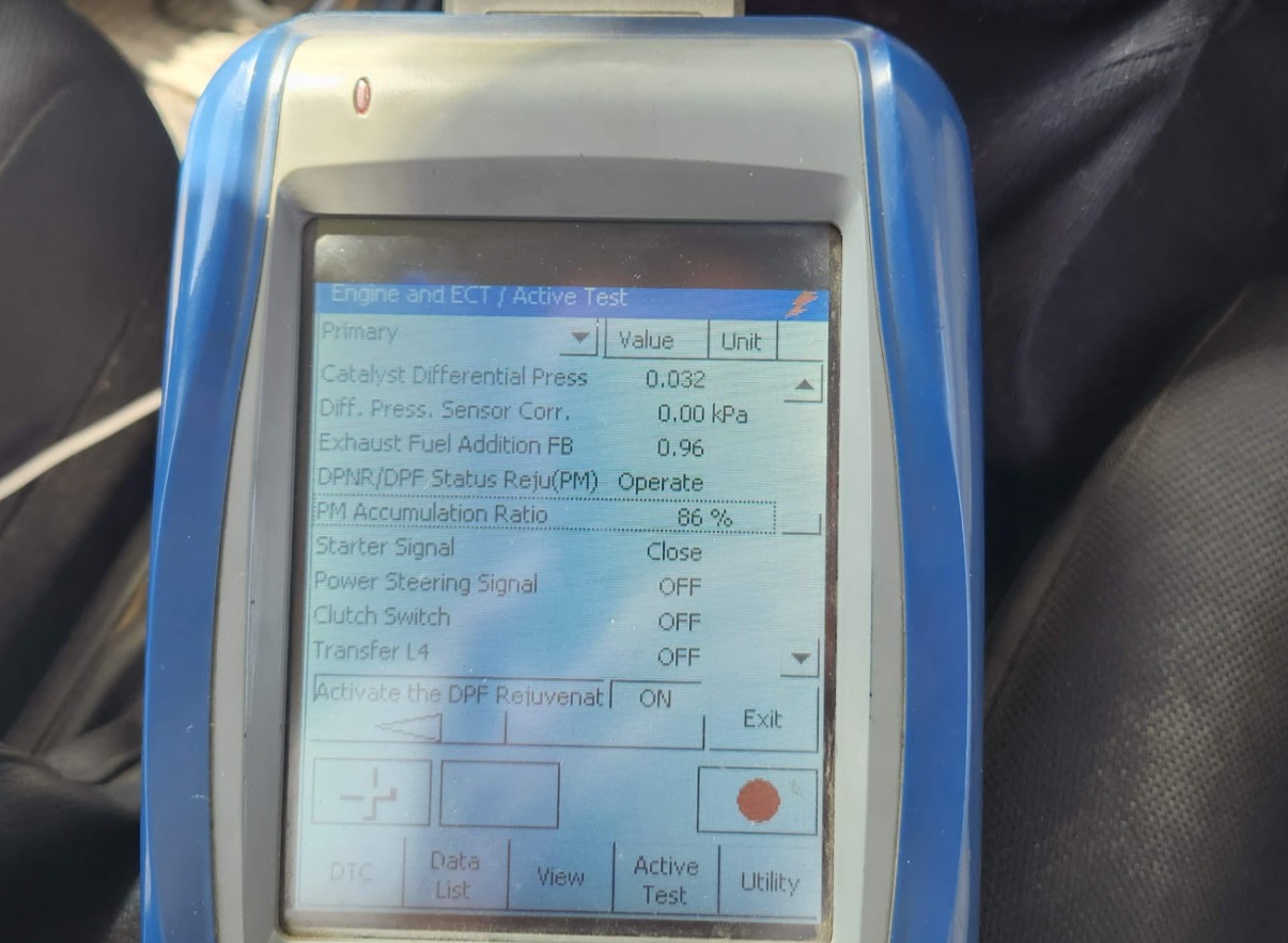 אחרי החג נסעתי לדילר שלי. חיברנו מחשב. הDPF היה מלא לרמה של 156% ( Particulate Matter Accumulation Ratio). הופעלה רגנרציה מאולצת דרך המחשב בפעם הראשונה. לקח כמעט שעה, לאט לאט האחוזים ירדו (בתמונה רואים 86%), נגמר לבד כשמגיע לאפס.