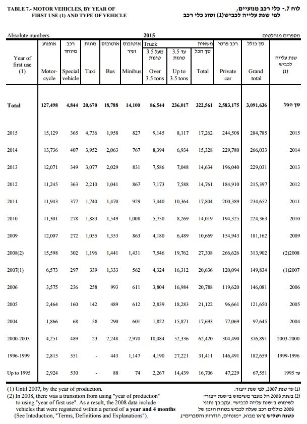 הנתונים ברורים: בשנת 2015, מתוך 3 מליון ו91 אלף כלי רכב (כל הסוגים) רק 67,500 יוצרו לפני שנת 95. שזה בערך 2%. כלומר, כל 20 שנה מתחלפים 98% מכלי הרכב על כבישי ישראל.