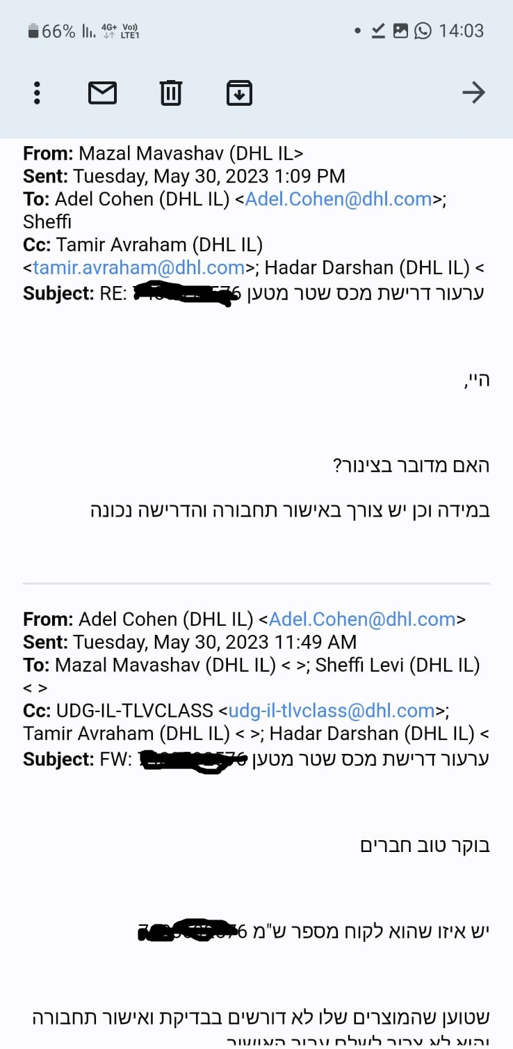הגיעה מ dhl דרישת אישור בודק של משרד התחבורה+ תשלום 120 ש''ח לפני מיסים.