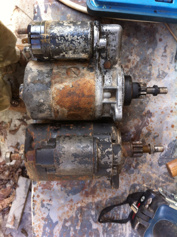 השוואה בין סטרטר של T2 לסטרטר של T25 קירור אוויר. למטה הסטרטר של הונאגון למעלה הסטרטר שלי. חדי העין יראו שהסטרטר של הונאגון מחובר לסונואיד שלו עם אומים משושים ולא עם השטות הזו של ברגים שטוחים. אפשר גם לראות שמיקום הסולנואיד שונה..