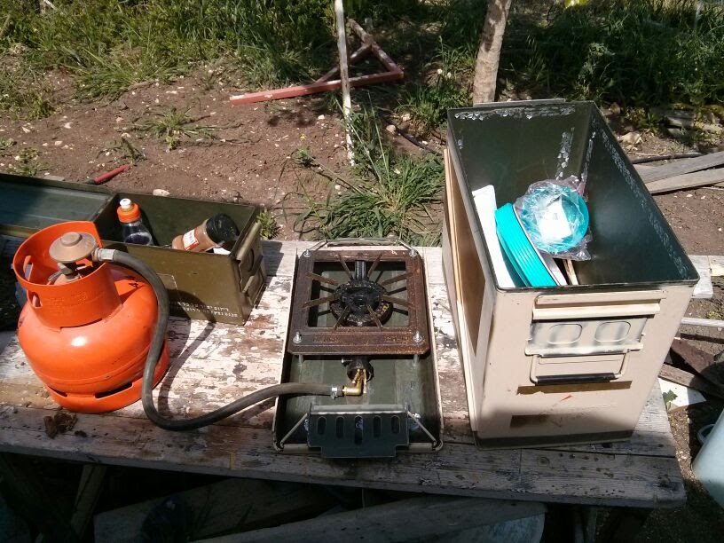 במקור זה ארגז פצמ"ר 81 (כן, רשמתי, בסדר, אני זוכר להביא לך אחד כזה בפעם הבאה שהוא נופל לי לידיים), שמאז שחולץ מצפורני ה7, מכיל בניחותא: בלון 2.5 קילו, כירה, קרש חיתוך, צלחות+כוסות+קערות+סכום ל6 נפשות (אנחנו רק 5, אבל לך תדע אולי אליהו יגיע דווקא לשטח), כפות גדולות, תרווד, מצקת, סבון כלים+סקוץ', שמן זית, תבלינים וכו'.