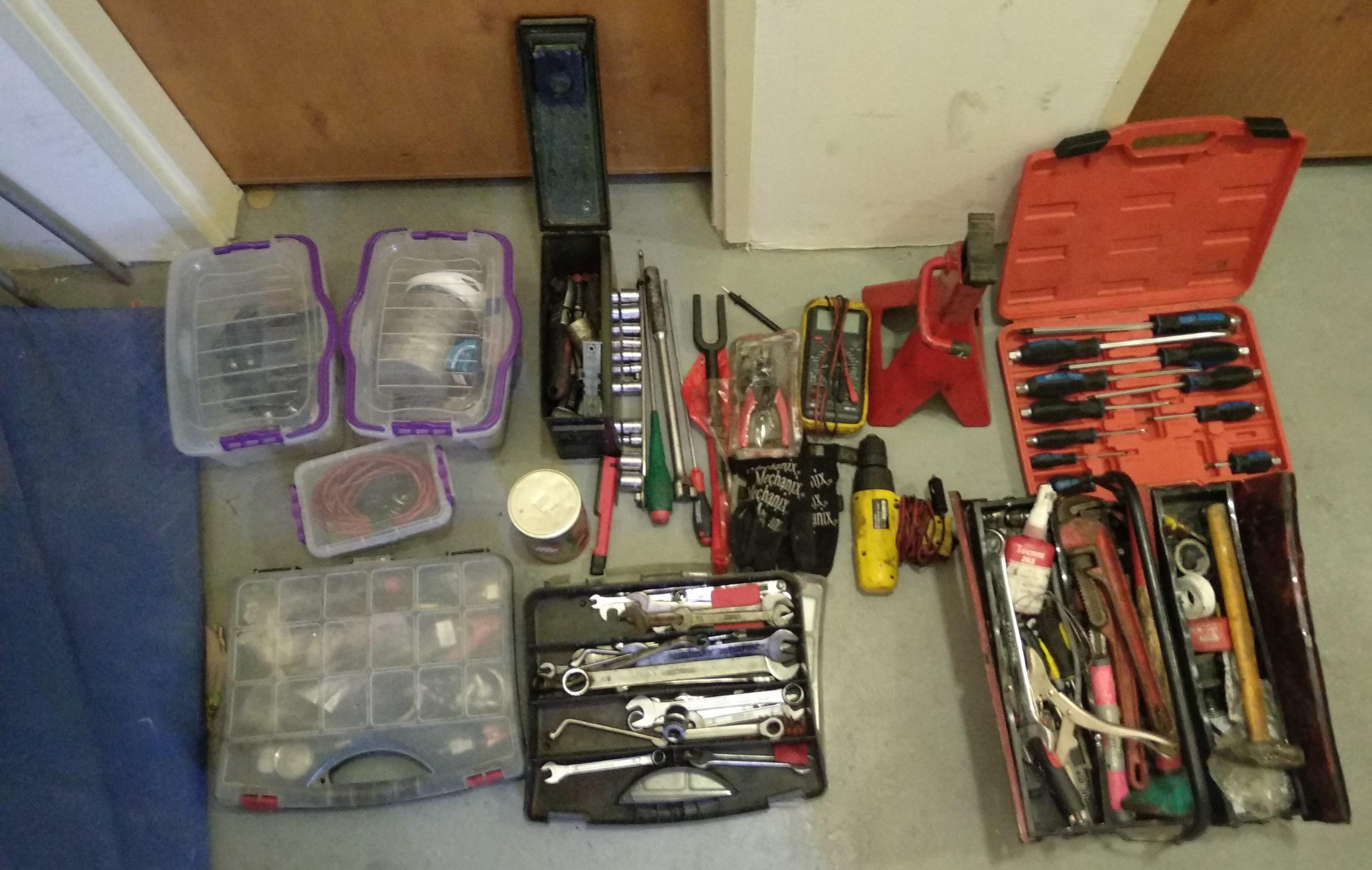 מפתח צינורות, שוודי בינוני, סט ראטצט 1/2, סט 1/4, מוט אלומיניום 1מ כמאריך, סט מפתחות פתוחים, מברג גדול+מברג דו-צדדי קטן, גליל איזולירבנד רחב, אזיקונים קטנים וגדולים, פטיש 300גר, רצועות מנוע+צינורות ראשיים שנשארו מההחלפה הקודמת, פיוזים ונורות ראשיות, rescue tape, u-bolt, מטר חוט חשמל, חוט חשמל כפול עם תנינים בקצה, מוט טלסקופי עם מגנט בקצה, גליל אפוקסי, שפורפרת סופר7, איזולירבנד שחור, פלאייר, מולטיטול של סוג, ובטח עוד כמה שאני לא זוכר בשליפה, וכל זה בחלל מאחורי הכיסא האחורי.