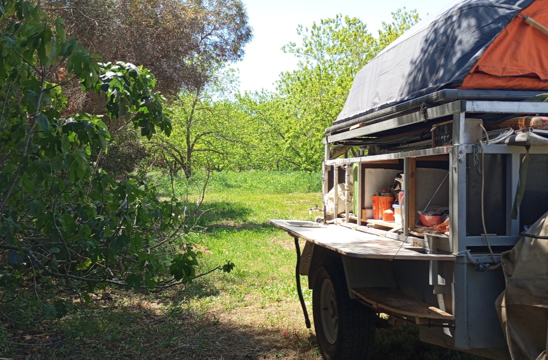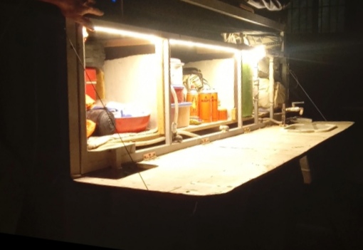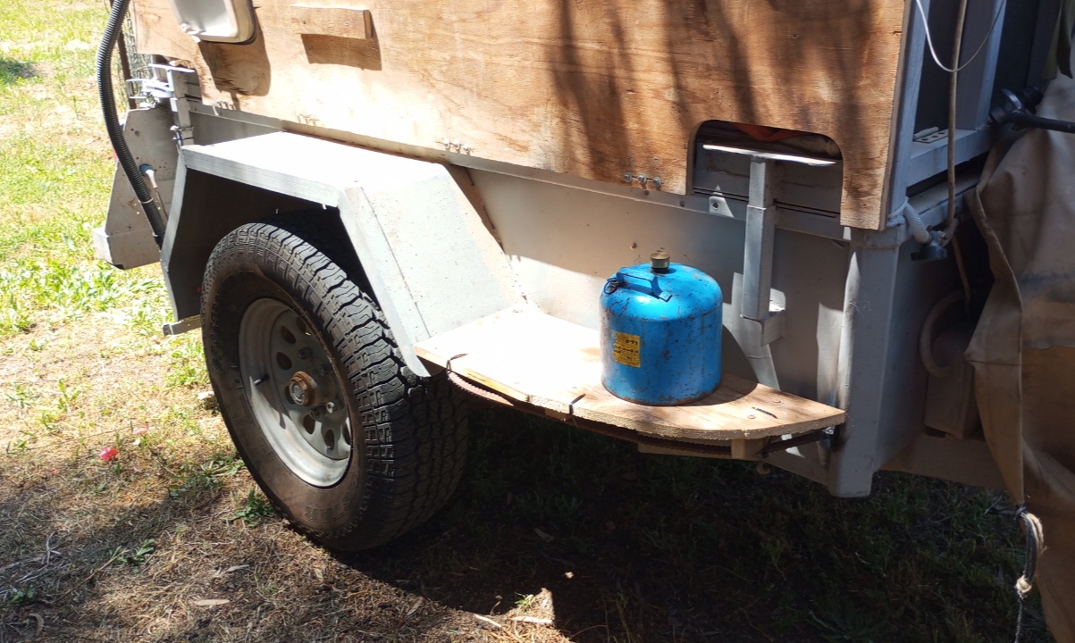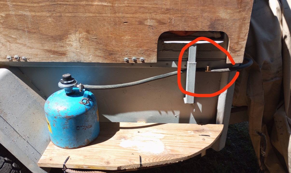 מדף למיכל גז שיתחבר גם לחימום מי מקלחת וגם לגזנע, ומהצד השני מקום לעצים למדורה, הכל משאריות.
