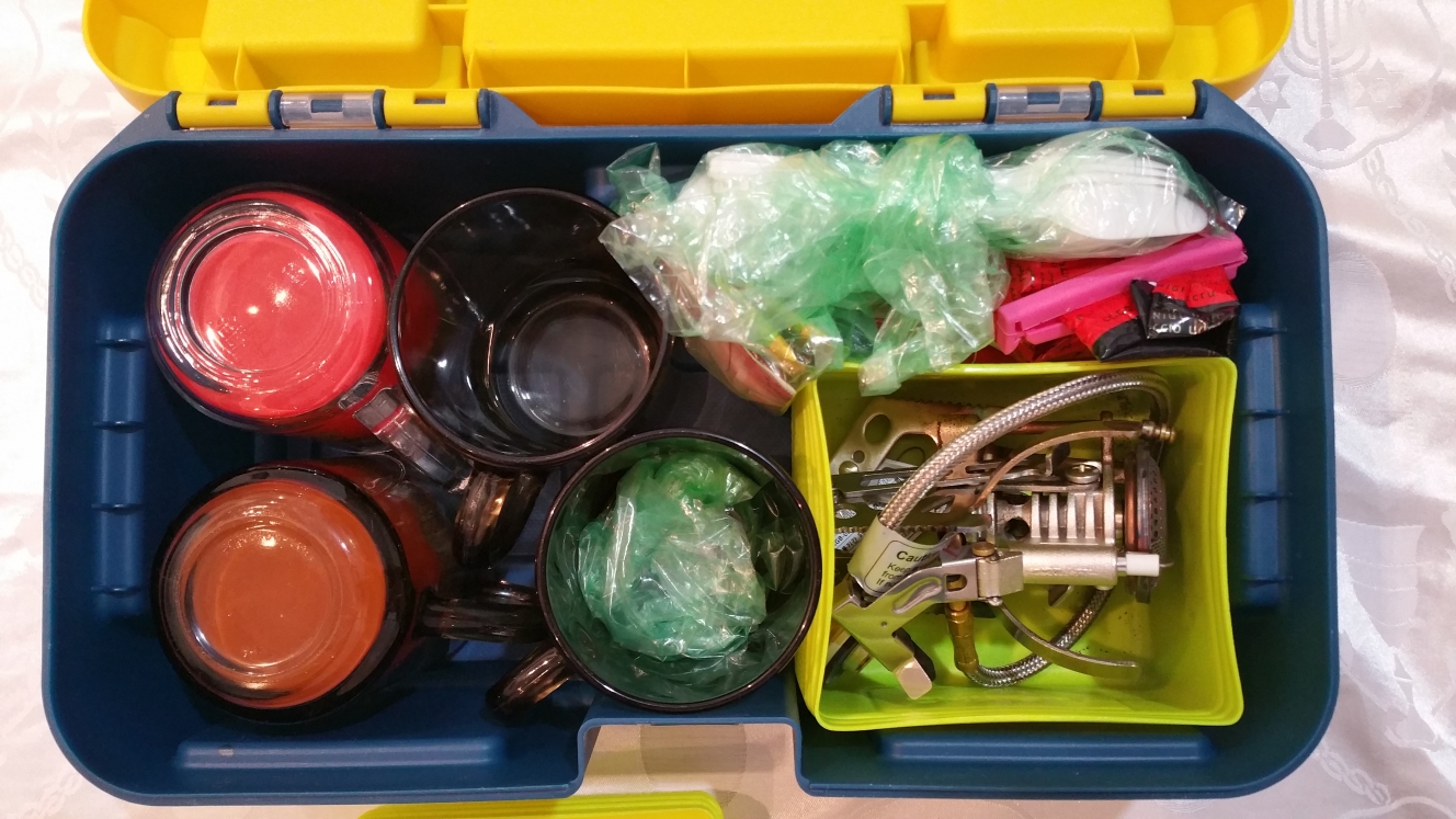 קפה עלית, תיונים של תה ירוק ויסוצקי בכל הטעמים, כלי לסוכר שנכנס לאחת הכוסות, סכו"ם חד"פ, גזיה אלפינית מונווקר של קובאה והכל בארגז כלים קטן (מלבד הפענדעלע ומיכל הגז) כי בג'ימני הכל קטן :cool: