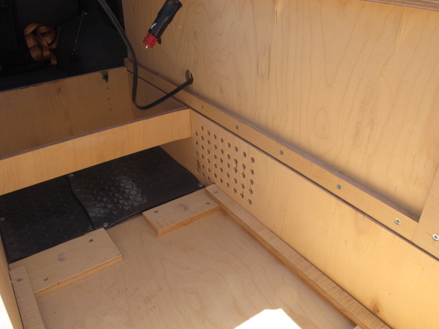 הכבל מגיח מאחורי המושבים האחוריים ומזין קופסת פיצול עם פיוזים שמזינה את המקרר, שקע מצת וקומפרסור.