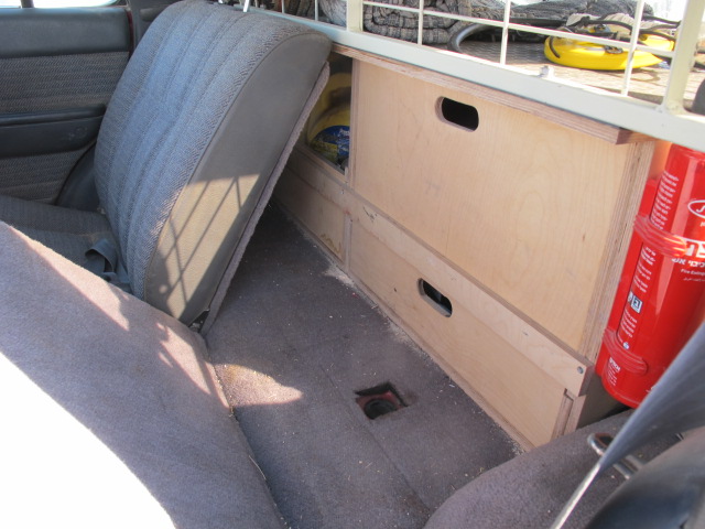 אחרי בניית והתקנת ארון המגירות נוצר "שטח מת" בינו ובין משענות המושבים האחוריים. כמובן שהוא התמלא בשונות אבל הנפח הזה פשוט דרש מיכל מים קבוע.