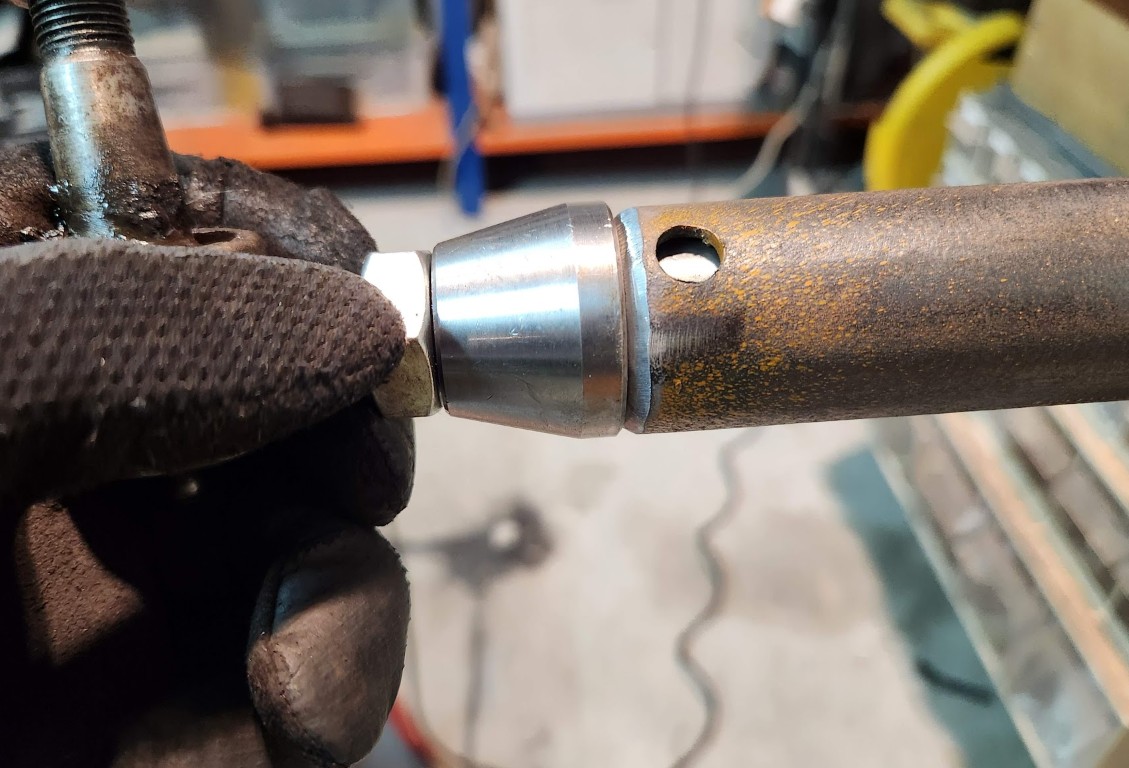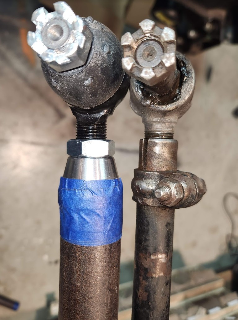 השלמתי עם מוט שפור ודראגלינק מחוזקים. שניהם בנויים זהה מצינור 1 צול סקדיול 40 (קוטר חיצוני 33.4 מ"מ, עובי דופן 3.38 מ"מ קוטר פנימי 26.6 מ"מ) ואינסרטים קנויים בקוטר אינץ' עם הברגה לתפוחי הגה מקוריים של CJ (הברגה עדינה 11/16"). המוט המחוזק כולל האומים בדיוק באורך של מוט מקורי 1110 מ"מ (מרחק בין התפוחים כרפרנס התחלתי- 1175 מ"מ). את הדראגלינק עשיתי אותו דבר כי כבר יש חומר ולמה לא להפטר מהתפוח הארוך המיוחד והיקר לתמיד (המרחק בין התפוחים בדראגלינק כשתיבת הגה פיקס באמצע 770 מ"מ).