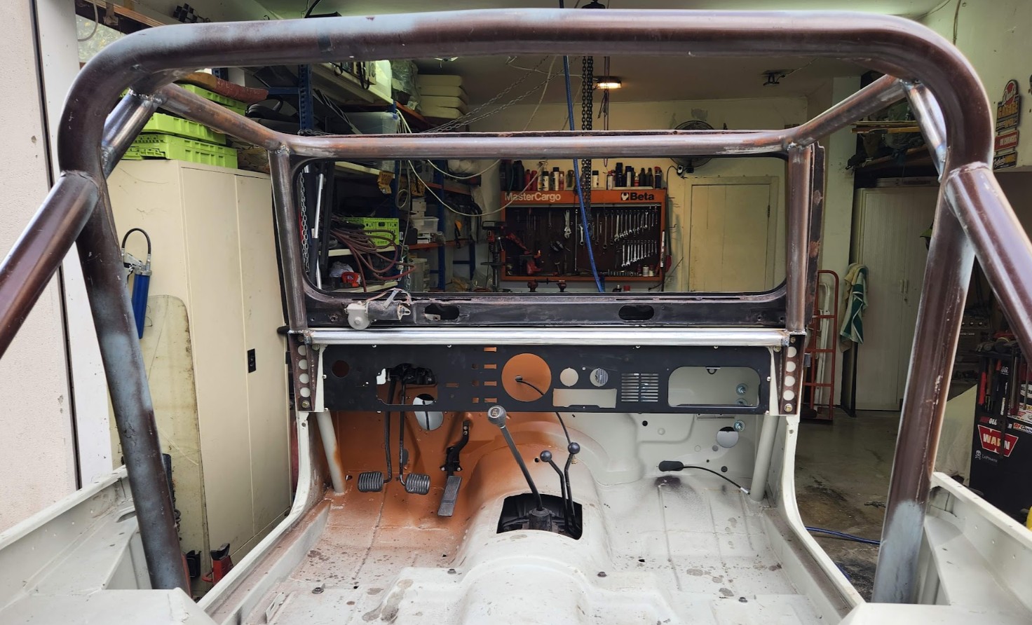 ונשאר לחשוב עם צריך גם חלק אחורי לכלוב. הוא בכל מקרה לא יהיה מבני ויהיה עשוי מוטות קלים אולי אפילו אלומיניום, המטרה היא רק להחזיק צל לחלק האחורי של הג'יפ. לא יהיו מושבים אבל יהיה מטען ולפעמים כלב.