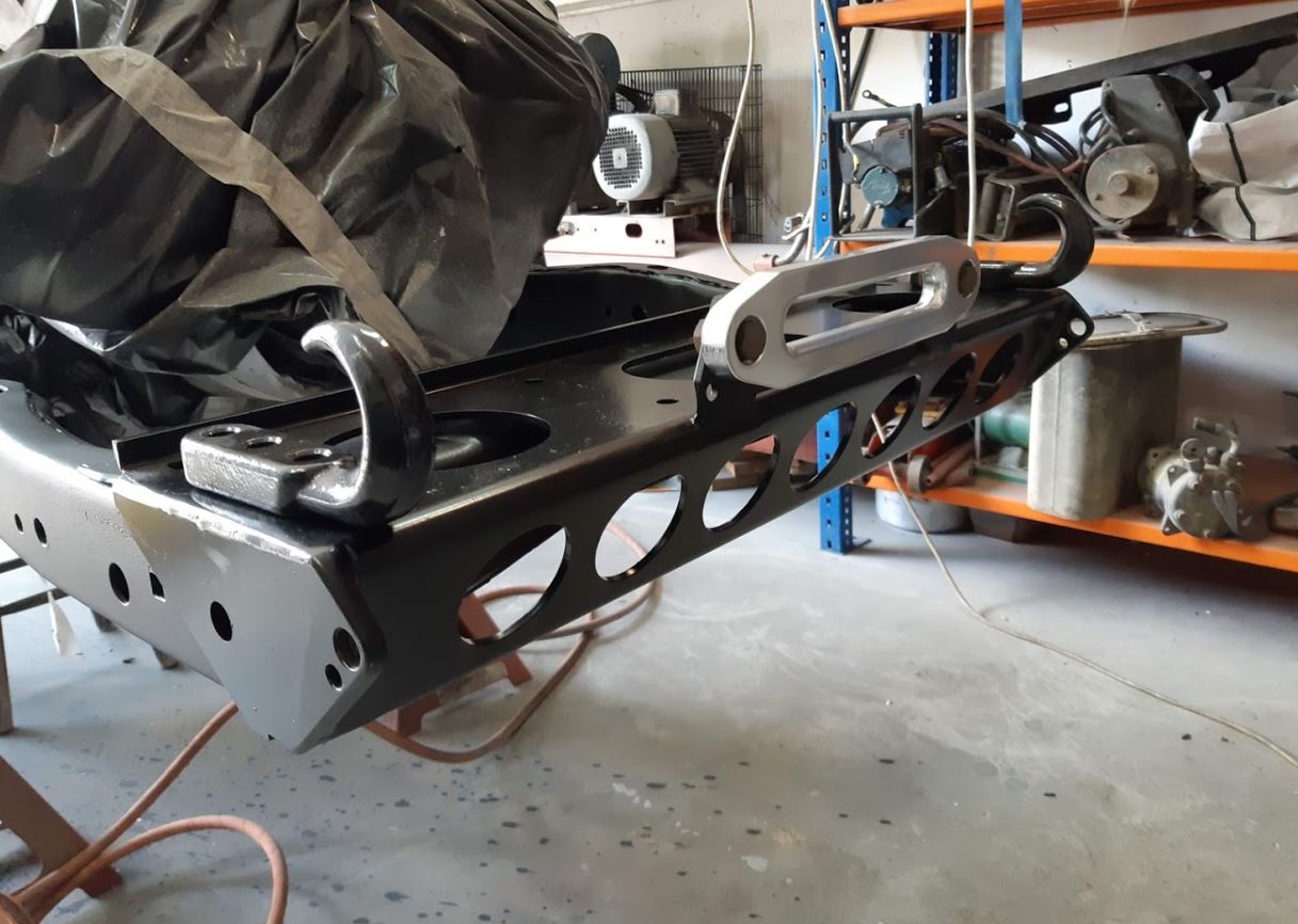סיימתי את עבודת הצביעה השחורה. השלדה, הסרנים, מיכל הדלק. את הסרן האחורי צבעתי בעצמי, את הקדמי שפירקתי לחלקים נתתי לניקוי חול וצבע בתנור.