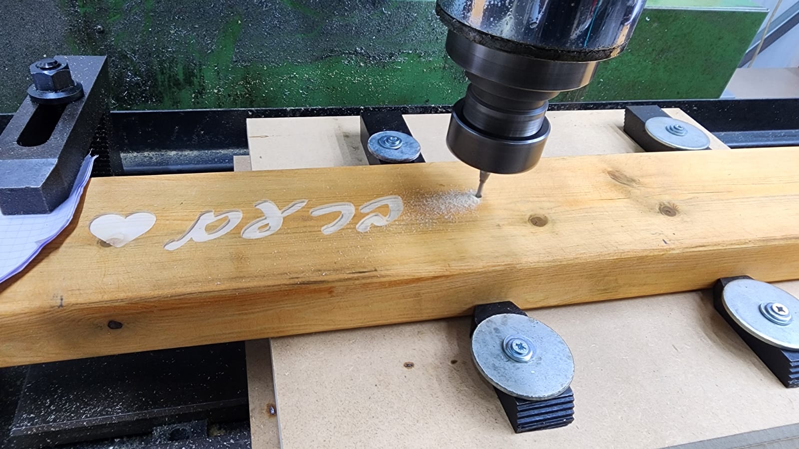 ובנוסף הקושי עם הגובה הוא לדפון תוך שמירה על איפוס של ציר הX של המכונה מול הקרש, כדי שהכתב יצא ישר.