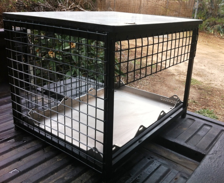 הסל בנוי מרשת גדר ישנה ועבה, והחיבורים עם ניטים פלדה וברגים לחיבור הרשת למשטח.