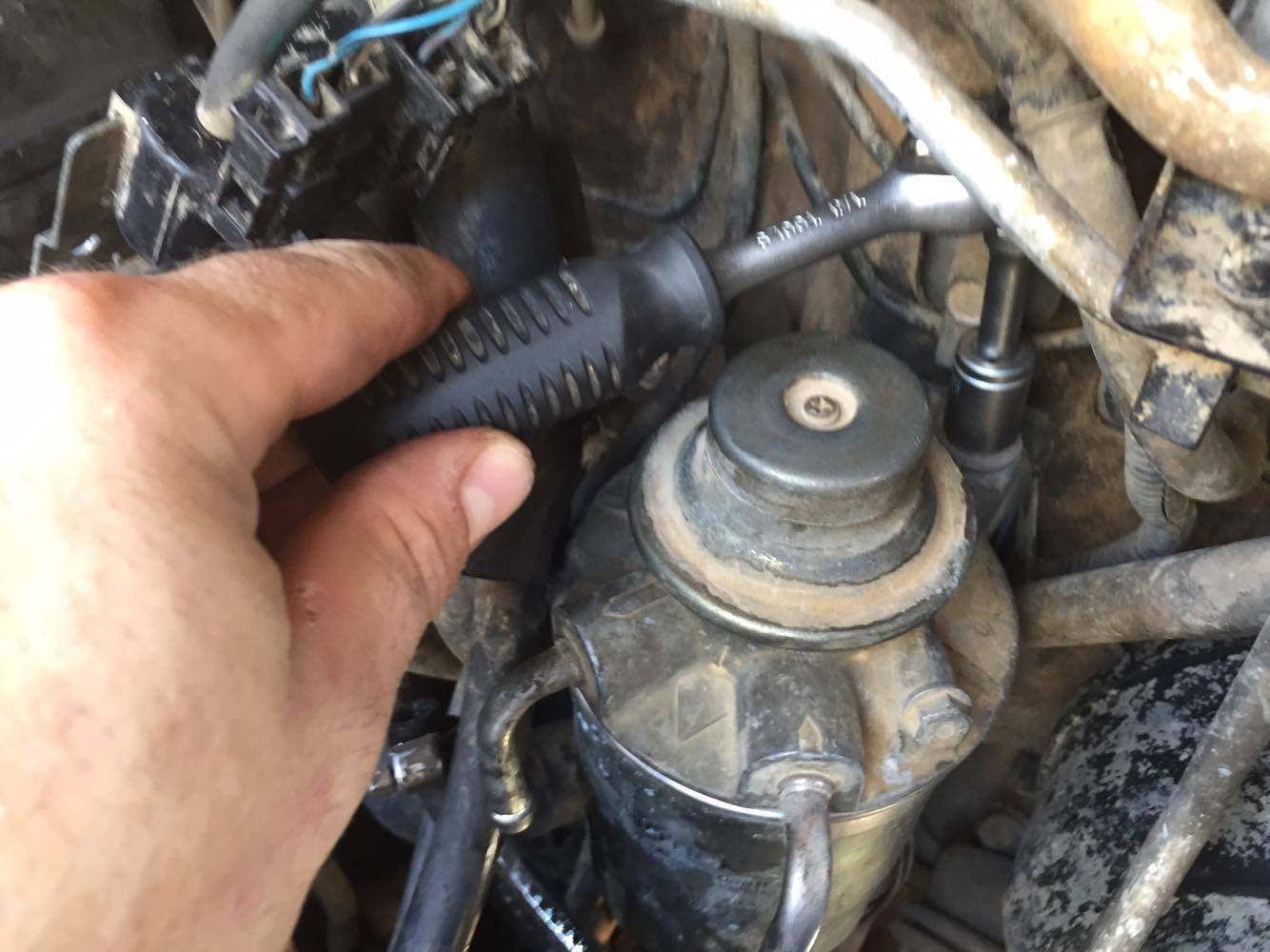 7.ננתק את הפילטר מבית הפילטר, לרוב ניתן לעשות זאת בעזרת כוח היד אך לעיתים זה לא הולך בקלות על כן נשתמש במלחציים ובמפתח פילטרים, ניתן ורצוי לשחרר את הפילטר בעזרת המפתח כשהוא עדיין מורכב עם בית התושבת על הרכב אך לעיתים נגלה שאני מספיק מקום לתמרון מפתח הפילטרים.