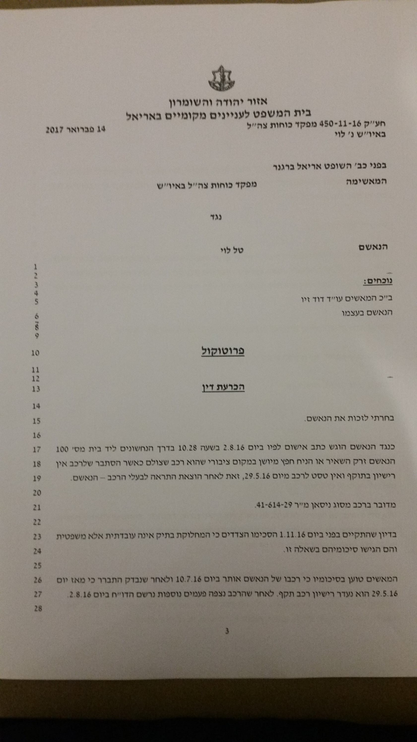 השופט המכובד קיבל את טיעוניי באופן מוחלט והחליט לזכותי מכתב האישום. (בהזדמנות אצרף את הסיכומים שלי ואת הכרעת הדין).