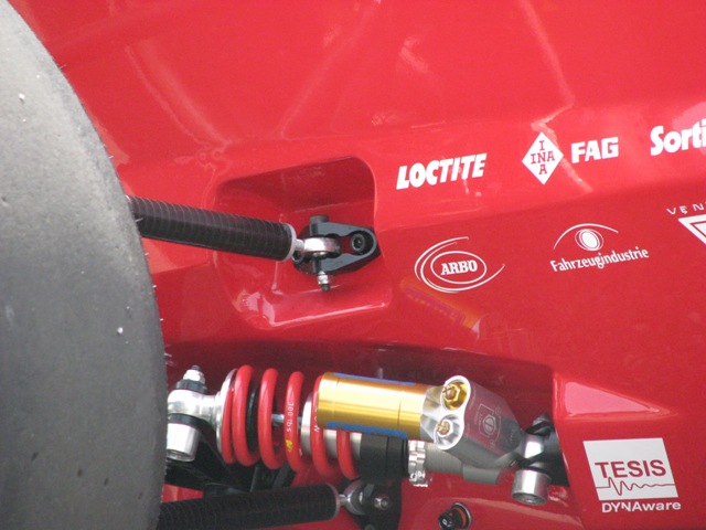 גלגל של אחת הקבוצות. כיסוי למניעת לכלוך הצמיג בעת שדוחפים את האוטו בין הבדיקות השונות. כמו כן ניתן לראות את הג'אנט המינימליסטי להחריד ואת החיבור הבודד לנאבה במרכז. חוסך המון משקל בלתי מוקפץ.