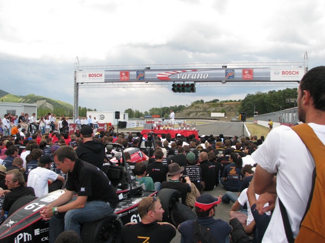אני אנסה לכתוב קצת בתקווה שאצליח להעביר חלק מהחוויה המיוחדת הזאת. מגיע למסלול ביום שישי בצהריים, בדיוק כשהרכב נכנס לבדיקות טכניות שמבלי לעבור אותן הרכב לא רשאי להתחרות ואפשר ללכת הביתה. השופטים האיטלקים (אנשי פרארי, פיאט, מזראטי וכו') בודקים את הרכב ברצינות ומבטים רציניים מוחלפים בינינו בזמן שהם מנסים להכניס תבנית עץ של מידות מינימליות בתוך תא הנהג ולא מצליחים. לאט לאט מגיעה הבשורה שהשלדה לא תקנית וצריך לתקנה. גם הרסטריקטור נמצא לא תקני, חלקית בגלל שהשופט מחליט לדחוף באלימות את המוט הבודק וכנראה מצליח לעוות במידה קטנה את הרסטריקטור. זו כבר בעייה רצינית לעצב מחדש רסטריקטור מקרבון, ולאחר התייעצויות וכמה ראיונות מבריקים מחליטים להשתמש ברסטריקטור אלומיניום שנבנה כמוק אפ לפני הזה מהקרבון. את פנים הרסטריקטור מצפים בסרט אלומיניום דביק כך שקוטרו הפנימי קטן. כך הלאה מתקנים בעיות שונות של עמידה בחוקים למול עיניהם המשתאות של השופטים שרגילים לראות קבוצות עומדות בחוסר עונים מול צרות שכאלו. מתקנים את הליקויים וחוזרים בדפיקות לב לשופט ושופטת צעירים יחסית שמחליטים לאפשר לנו לעבור לאחר התיעצות עם שופט מבוגר יותר שכנראה "נדלק" על הקבוצה וסיפורה המיוחד. ממשיכים הלאה לשאר הבדיקות - הרכב מורם 60 מעלות בשיפוע צד לבדוק שהוא אינו מתהפך ושנוזלים אינם יוצאים (בשלב זה אני מחזיק אצבעות שדלק לא ינזל מהמיכל היות ואין נשם עם קפיץ וכל עוד הרכב אינו הפוך דלק יכול לנזול), עושים בדיקת רעש אותה אנו עוברים רק בסיבוב השלישי ומספיקים לעשות גם בדיקת בלימה שמוכיחה שהרכב מסוגל לנעול 4 גלגלים. סדר היום בתחרות בנוי כך שהמסלול פתוח לנו מ8 בבוקר עד לאותה שעה בערב, פחות או יותר. בשאר הזמן אנו נמצאים באיזור הקמפינג קילומטר מהמסלול, עם שאר הקבוצות שמגיעות מכל העולם. המקום שוקק חיים בלילות והקבוצות מכלות ארגזים על ארגזים של בירות במשחקי שתייה לתוך הלילה, פשוט חיות אדם האירופאים האלה. הדינמיקה לאורך כל התחרות היא של שיתוף ופרגון מצד כל הקבוצות וישנה עזרה הדדית ושיתוף בכלים וחומרים. אנו מוצאים את עצמינו יושבים עם שאר המתחרים על בירות בלילות, מחליפים חוויות ובכלל מתקשים לענות על השאלה החוזרת "למה ספורט מוטורי לא חוקי בישראל?". בעוד אנחנו בני 26-30 בקבוצה, למודי שירות צבאי וחיים לא פשוטים (אם כי בעלי משמעות, לדעתי לפחות) בישראל, מתחרינו בני 20 בממוצע, חיים ונושמים את עולם הרכב. פגישה מקרית בשלושה חבר'ה מגלה שבסופי השבוע הם לוקחים את מכוניות המירוץ הישנות של הקבוצה שלהן ומתחרים בינהם לכיף, ושהם עובדים עבודות סטודנט במרצדס ופורשה...