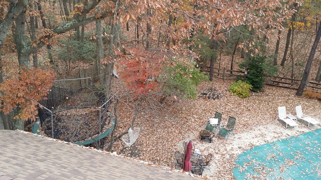 צילמתי מהגג, משום שלפני שמנקים את החצר, צריך לנקות את המרזבים - גם כמה עשרות טובות של קג' של שלכת. הניקויי מתבצע ע"י מפוח עלים. מטפסים על הגג המשופע (בגובה של קומה שלישית!!), מתקרבים לקצה ועוברים עם המפוח לאורך הגג - המושג "על הקצה" מקבל משמעות.. ממשית. פחד אלוהים (המקסיקנים שעובדים בזה נקשרים בריתמות וכאלה אבל אנחנו, הישראלי, יודעים טוב יותר..).