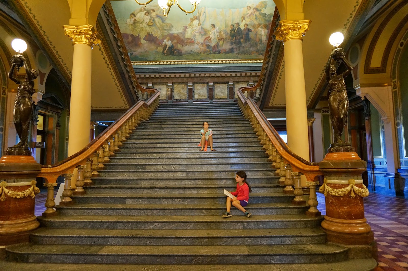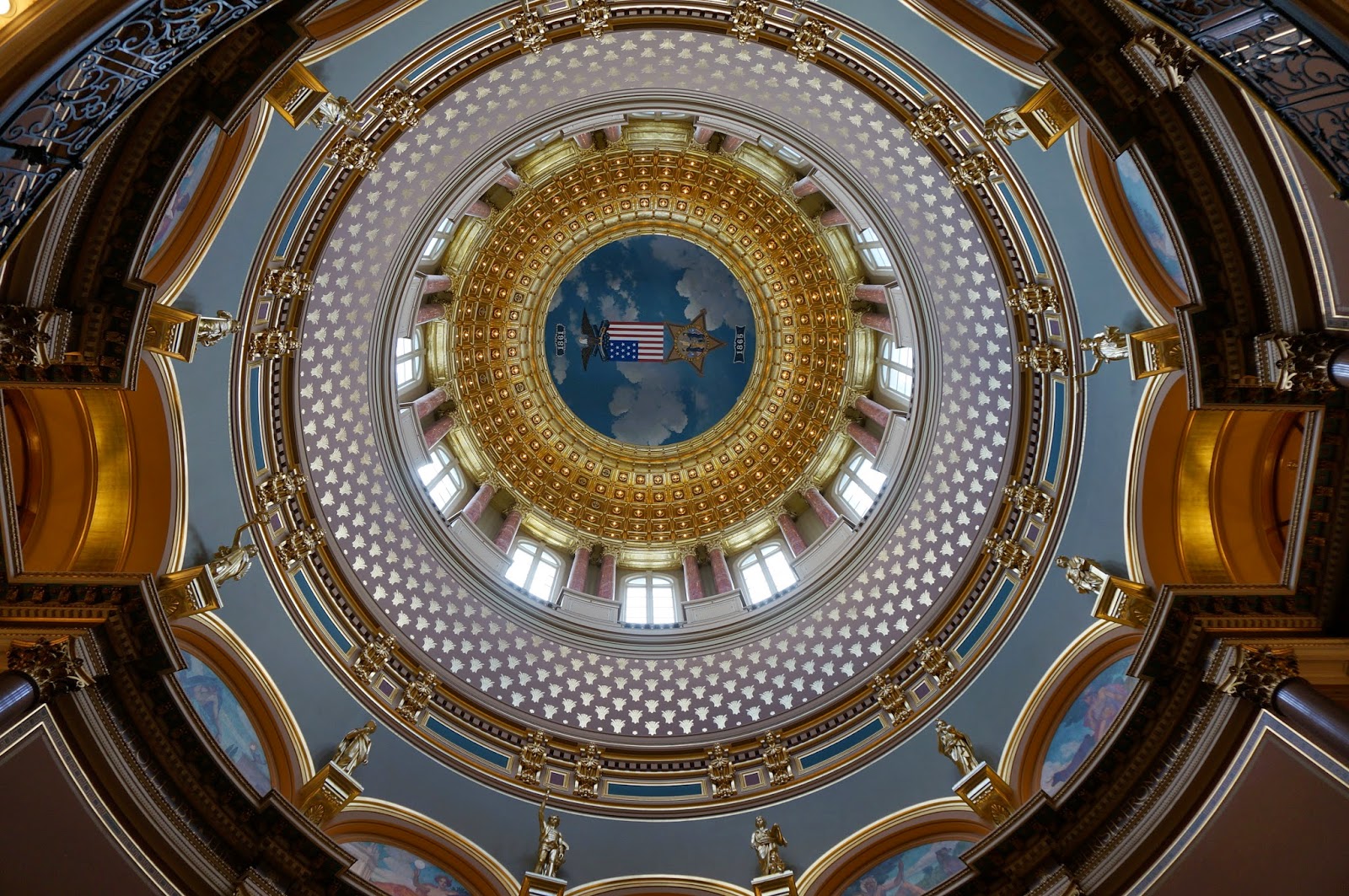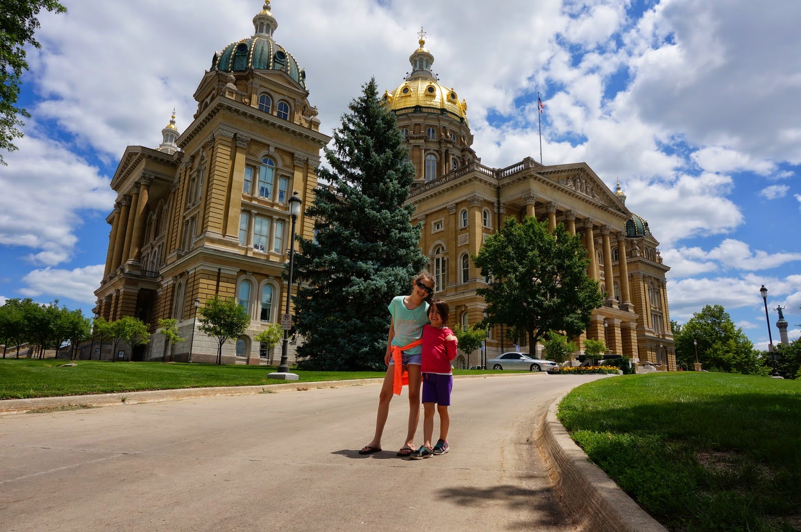 בכל זאת תיירים וכו, יצאנו בבוקר ברגל לאכול ולראות את הבנין היחיד שנראה שווה תמונה - הקפיטול של מדינת איווה. האמת הבנין מרשים - מפואר מאד, במיוחד הספרייה. ובזאת מיצינו - חזרנו לרכב, שאגב הוחנה באופן מעורר השראה ערב קודם, ברוורס בין מכונית חונה לבין הקיר - ברנרד משתפר. וחזרנו לכביש שדות התירס לעוד 5 שעות נסיעה, לנברסקה לעצירת לילה.