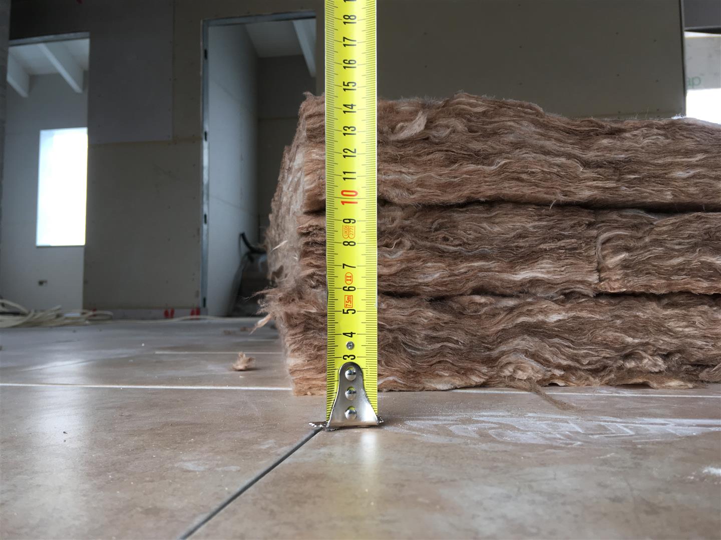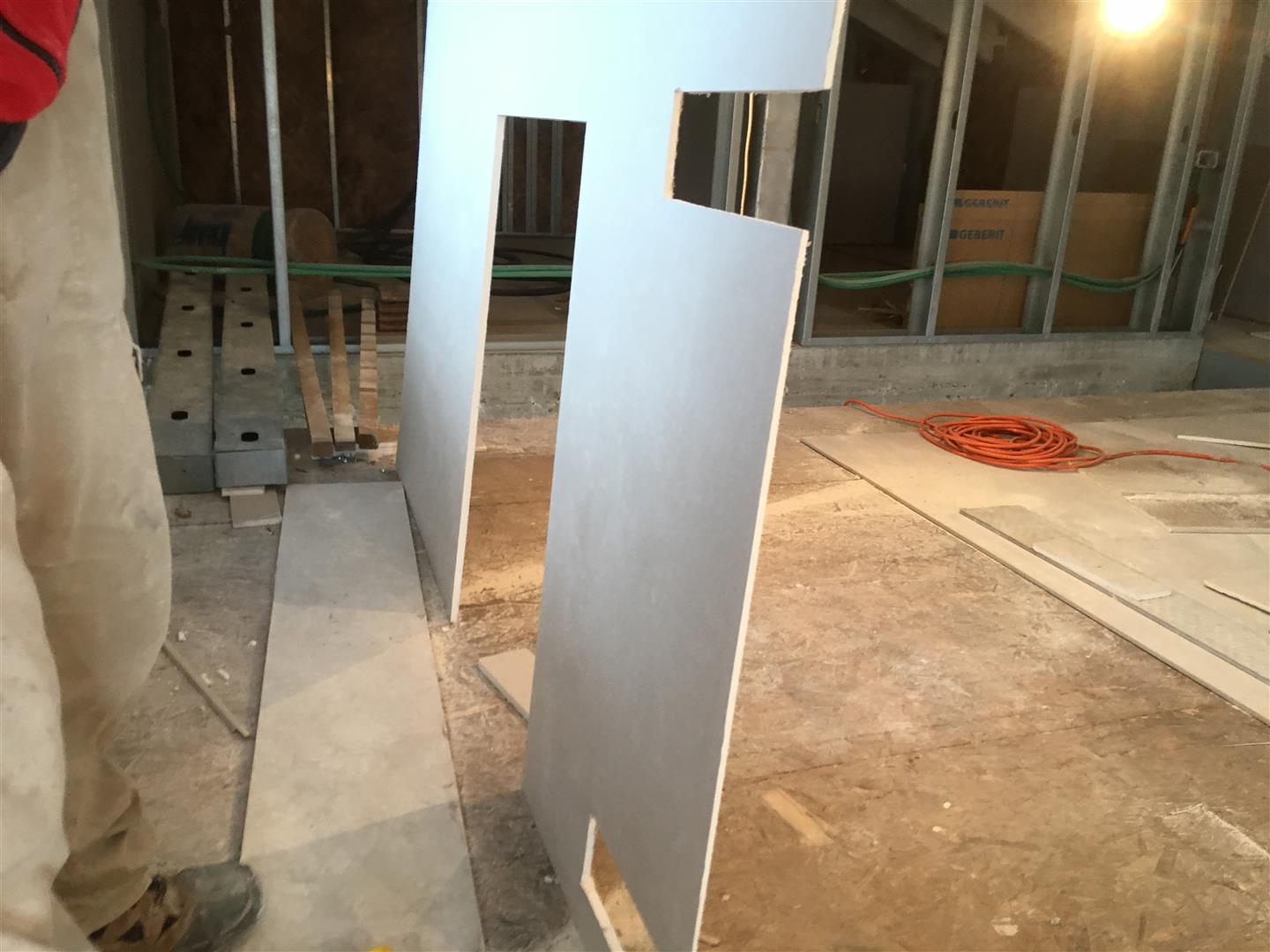 כבר כתבתי על הגבס בעבר, אז תקציר למי שלא זוכר כל הבית מצופה בשתי שכבות גבס מבפנים. שכבה ראשונה פלטות שוכבות (בהסטה, כמו לבנים ברוב המקומות) ושכבה שנייה פלטות עומדות (ובשכבה הזו יש שימוש בפלטות עם 4 פאזות לטובת החיבורים האופקיים).