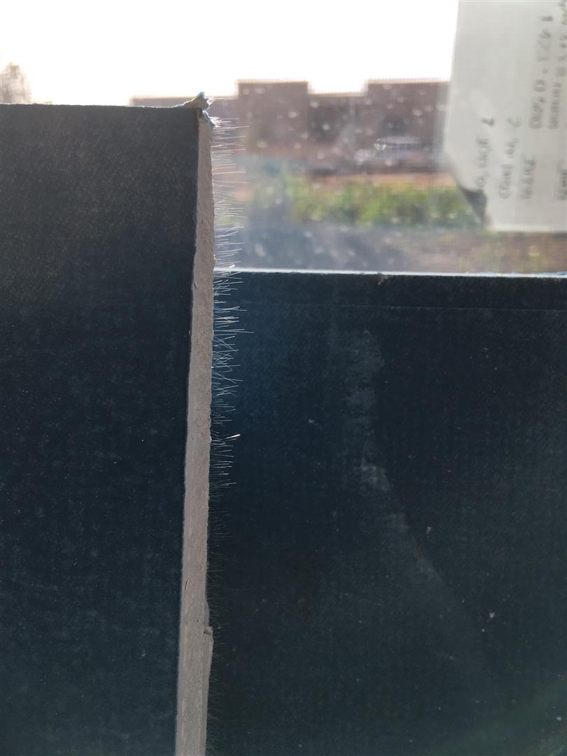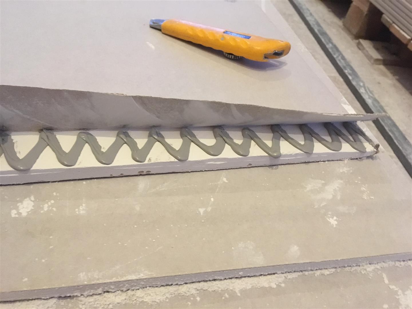 ישנם מקומות בהן הפאזות של הפלטה לא נותנות מענה ויש צורך להכין פאזות לבד. ישנו כלי יעודי לעניין אבל הוא ייקר עבורי (אני לא מתכנן עוד הרבה עבודות גבס בקרוב...) ולכן בעזרת דיסק יהלום 4.5 חירצתי את הפלטה ולאחר מכן הדבקתי חזרה וייצרתי פאזה במקומות הנדרשים.