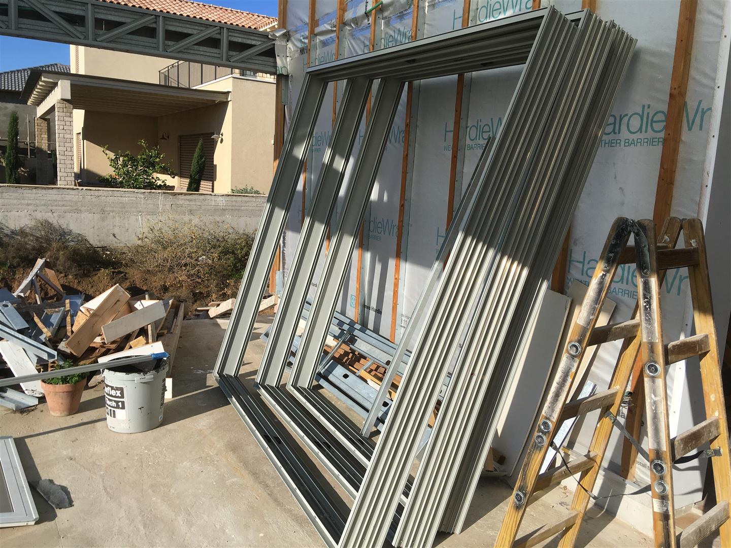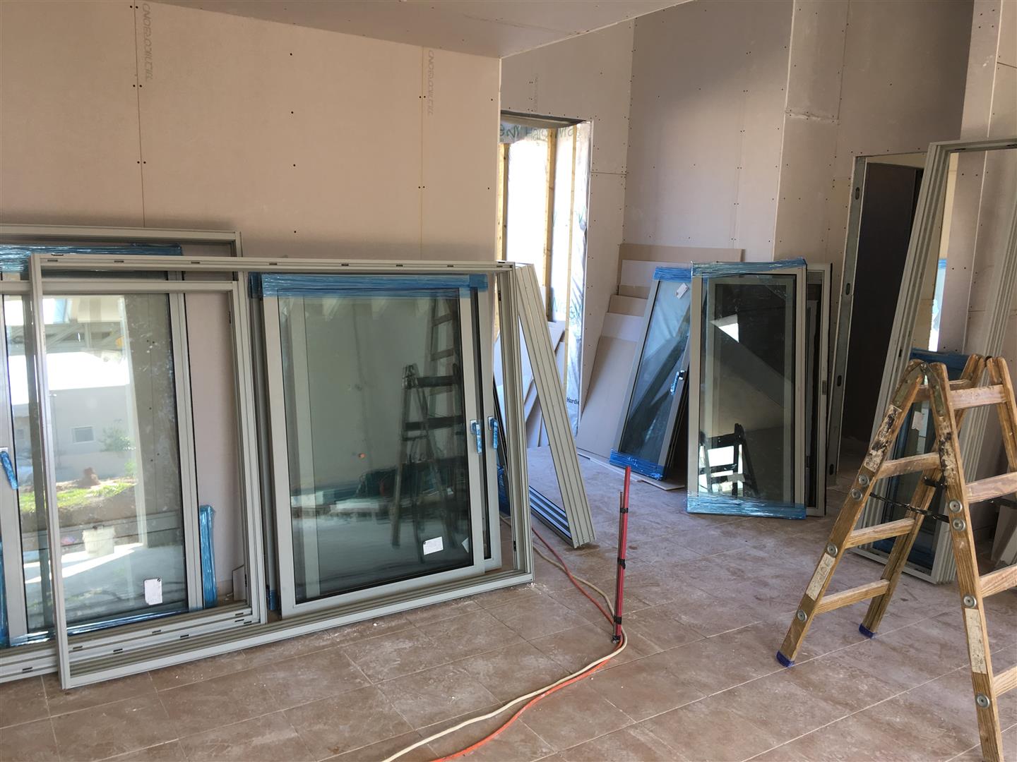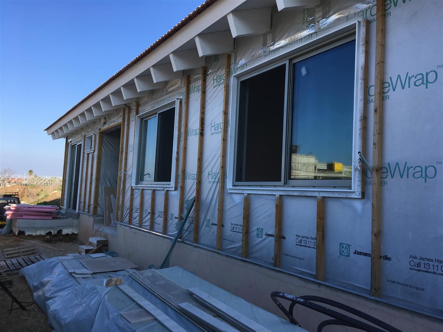 תוך כדי שאני עובד על השכבה השנייה של הגבס הגיעו החלונות שהזמנו (על איך בוחרים צבע לחלון אני לא ארחיב כי אין מספיק מקום בשרתים של ג'יפולוג, אבל אסכם שבחרנו בסוף צבע RAL 7038) והותקנו באותו היום