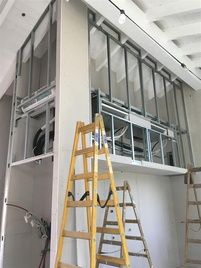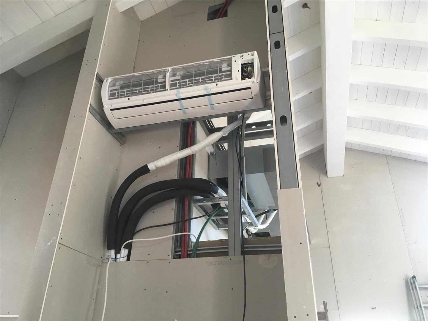 השלב הבא הוא להתקין את המזגנים הנסתרים על מנת שאוכל לבנות את ההרחקה של הקיר שמסתירה אותם. לטובת העניין איש המיזוג שלי בנה להם קונסטרוקצייה שעליה הם ניתלו ואני בניתי מסביב את קונסטרוקציית הגבס להסתרה)